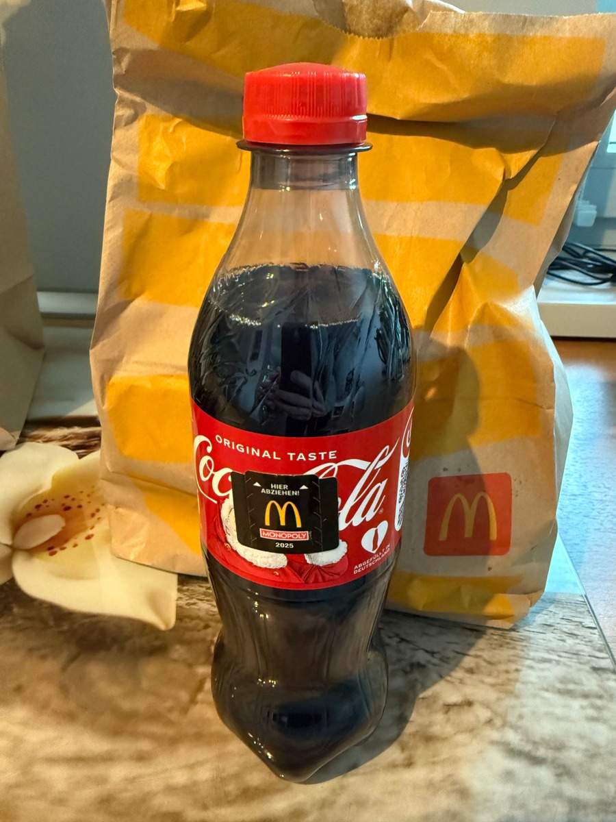 Die Cola kam erfreulicherweise nicht aus den Automaten, sondern als eine komplette 0,5 Liter PET Flasche mit Monopoly Gewinnspiel Aufkleber. Das finde ich grundsätzlich besser als die zusammengemischte Cola Plörre aus den McDonald's Automaten. Ein Punkt, den ich dem Lieferdienst anrechne. Allerdings hätte die Flasche noch gekühlt sein können. Sie war bei Raumtemperatur, was bei einer Cola ja nicht ideal ist. Aber auch das war kein Deal Breaker.