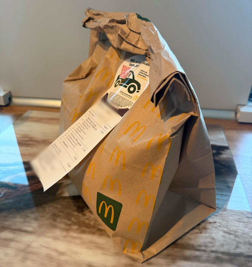 Das Essen kam, wie zu erwarten, in einer klassischen McDonald's Tüte an. Doch die überraschte mich damit, dass sie wiederum in eine größere Tüte eingepackt war. Das fand ich etwas merkwürdig und ehrlich gesagt unnötig. Es führt nur zu mehr Müll und ändert nicht wirklich etwas am Zustand des Essens. Man könnte es auch einfach so in einer etwas verstärkten Tüte verpacken und die Umwelt würde es danken. Aber gut, das ist ein Detail, das eher an die Logistik und nicht an das Restaurant selbst geht.