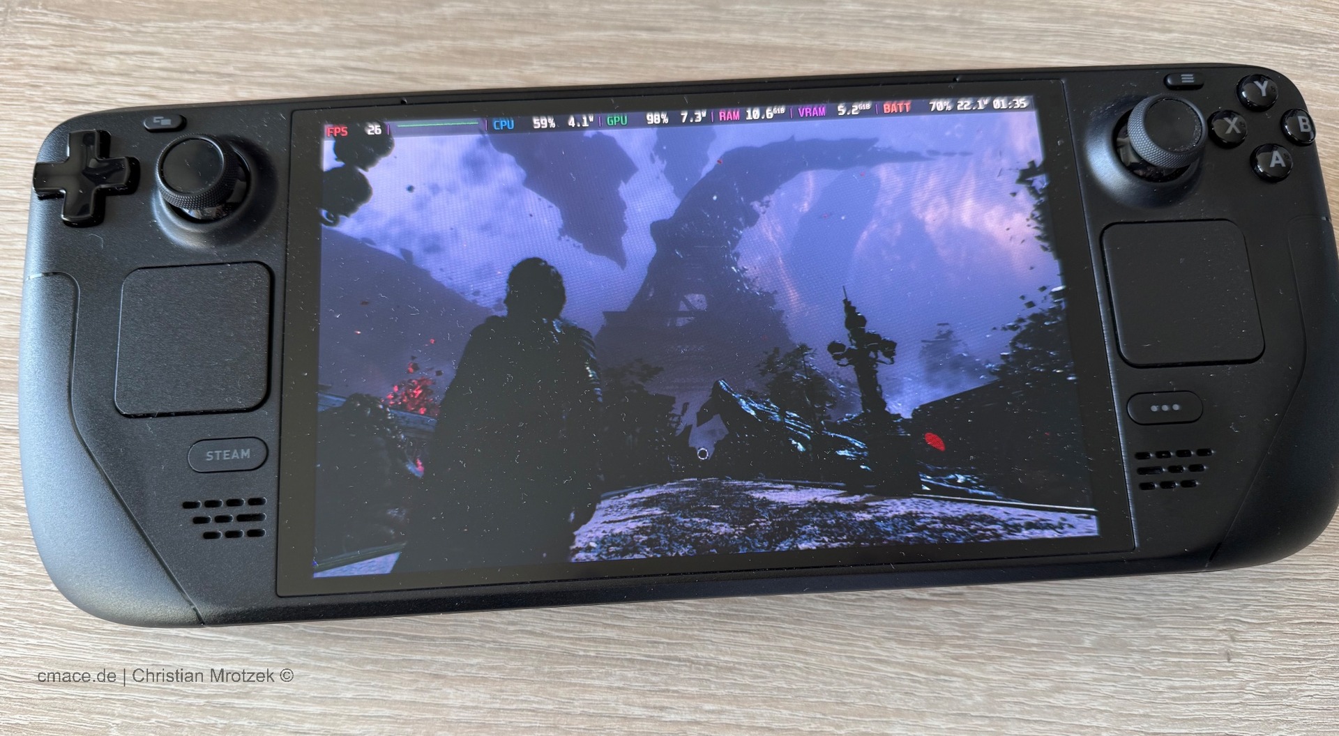 Es gibt zwar eine eigens vorgesehene Grafik Preset Konfiguration für das Deck, und rein funktional lässt sich das Spiel darauf absolvieren. Im direkten Vergleich zur PC Version sieht die Präsentation jedoch deutlich verwaschener und unschärfer aus, was dem ansonsten so beeindruckenden Art Design nicht gerecht wird. Noch gravierender sind für mich die Bildraten: In weniger anspruchsvollen Szenen sind um die fünfundzwanzig Bilder pro Sekunde möglich, sobald jedoch mehr Effekte, Partikel und aufwendige Umgebungen ins Spiel kommen, brechen die Frames spürbar ein.