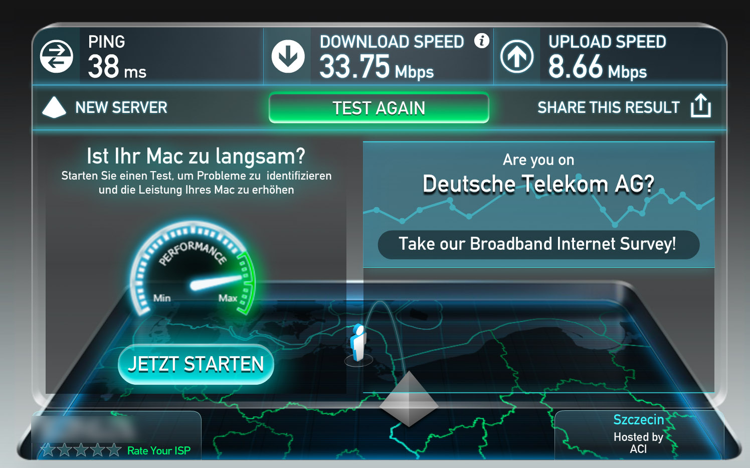 Daraufhin checkte ich erstmal meine öffentliche IP Adresse und machte einen Speedtest. Die Weboberfläche verriet mir schon, dass ich mit 50 Mbit/s Downstream und 10 Mbit/s Upstream verbunden bin. Ein kleines Upgrade meines Anschlusses, denn ich habe nur 32Mbit/s Down und 2Mbit/s Up. Ein Speedtest bewies ebenfalls, dass ich schneller unterwegs bin, als "zu Hause". Egal wessen Anschluss dies ist, er zahlt auf jeden Fall zu viel. Der Speedtest ergab nämlich nur 33Mbit/s Downstream, statt der verbundenen 50Mbit/s.