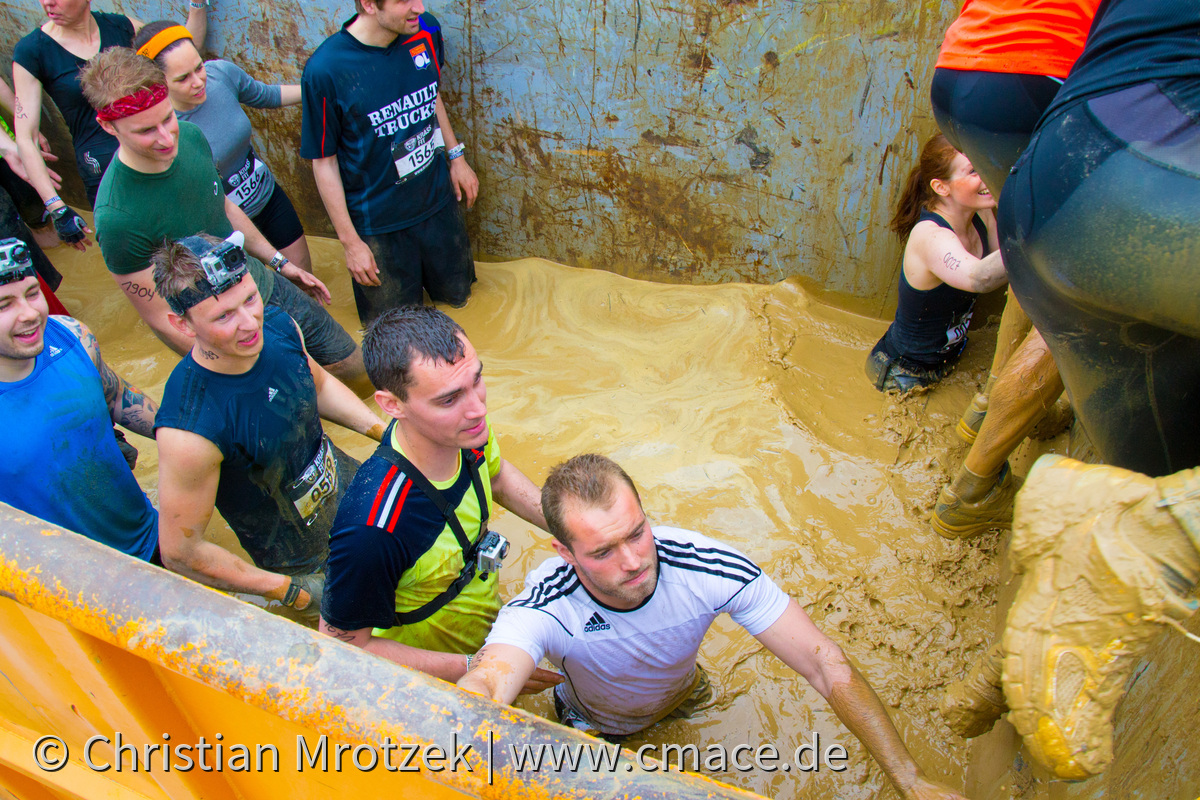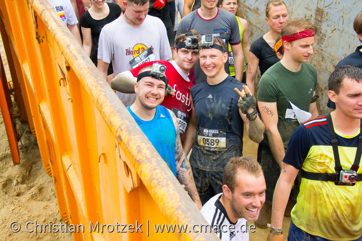 Auf seine Klamotten sollte man bei einem solchen Lauf nicht achten. Man kann eigentlich davon ausgehen, dass man auch einiges wegwerfen kann nach der Challenge. Das erste Hindernis war ein mit schmutzigen Wasser befülltes Becken. Darauf folgte ein Krabbelpfad, bei welchem wir unter Zäunen kriechen mussten. Damit waren wir schon mal nass und vollkommen dreckig. Als drittes Hindernis gab es zwei große Container, die mit Schlamm gefüllt waren. Es folgten Wände, über welche wir klettern mussten, Plattformen, auf welche wir uns mit Seilen hochziehen mussten, Netze, Balken, Gruben, Rutschen und vieles mehr. Alle paar Meter mussten wir uns irgendwo hochziehen, hochklettern, runterrutschen, durchkriechen, langhangeln oder gelegentlich auch etwas ziehen oder tragen. Es war definitiv anstrengend und ermüdend.