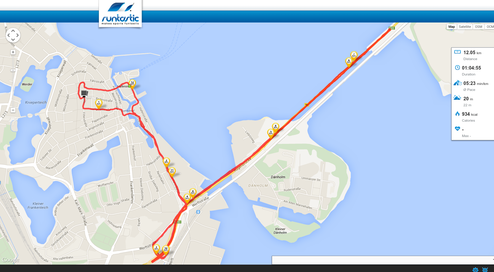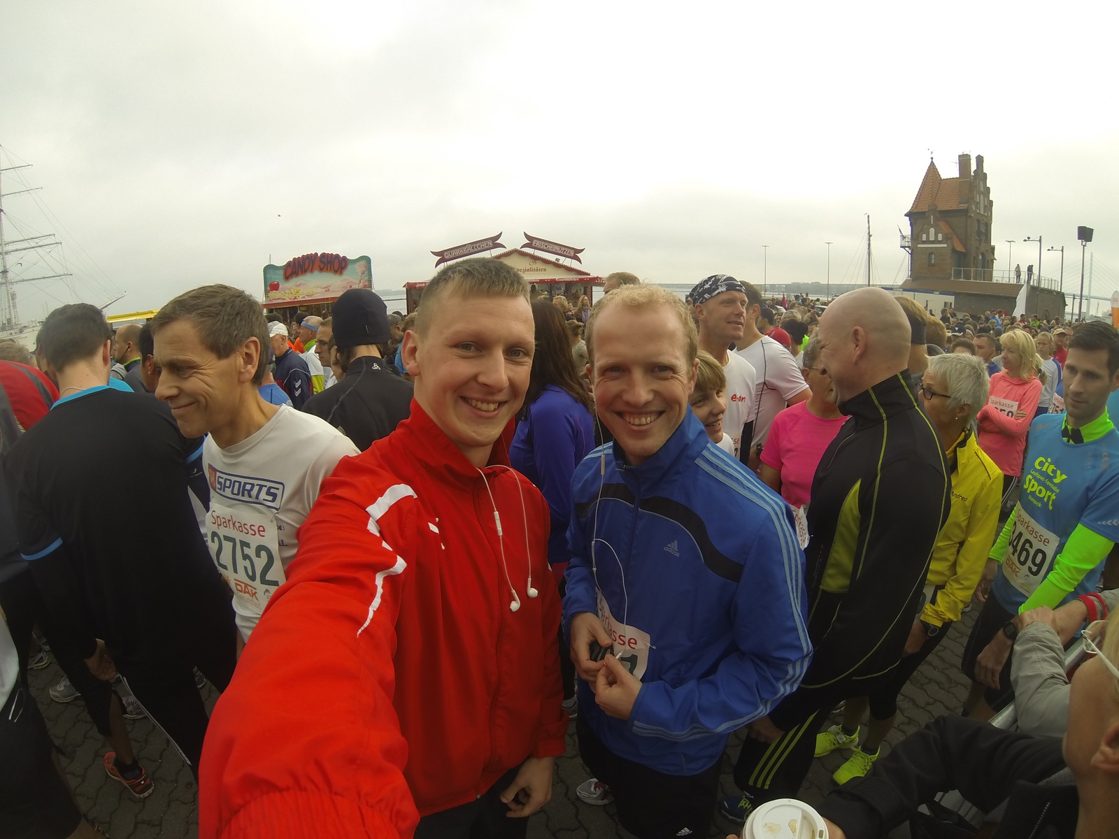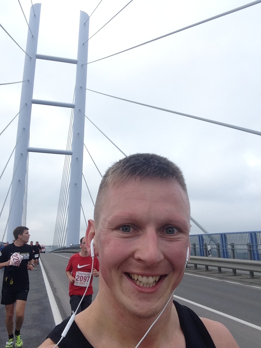 Samstag begab ich mich dann nach einer kleinen Aufwärmung zu Hause an den Start zum Ozeaneum. Dort begann mein Lauf zusammen mit ca. 800 weiteren Läufern um 11:30 Uhr. Durch die Altstadt entlang am Hafen zur Auffahrt des Rügenzubringers waren die Massen noch recht dicht beieinander. An der Total Tankstelle ging es dann auf die Brücke, welche wir einmal überqueren mussten. Am Ende der Brücke war der Wendepunkt, wo es dann dieselbe Strecke wieder zurück ging. Einen Versorgungsstand gab es auf dem Rückweg, bei welchem man einen Becher Wasser trinken konnte.