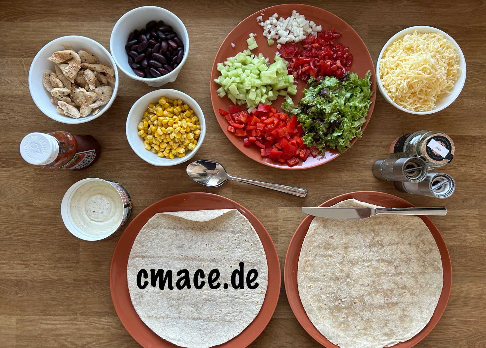 Bestreiche den gesamten Wrap zuerst großzügig mit dem Frischkäse und streue anschließend Salz und Pfeffer darüber. Wir haben das Ganze noch um eine Schicht Pizzagewürz (z.B. von Ankerkraut) ergänzt, was dem Wrap noch einen leckeren Oregano Geschmack verleiht. Danach beginnst du eine Hälfte des Wraps mit den Zutaten zu belegen. Beginne mit Mais und Kidneybohnen, danach Tomate, Gurke, Paprika und Zwiebeln. Anschließend kannst du den Salat darüber verteilen. Als nächstes nimmst du dir das Hähnchen und legst es darüber. Optional kannst du das Hähnchen nun noch mit der BBQ Sauce leicht bestreichen. Nun kommt der Käse zum Einsatz. Diesen verteilst du nach Bedarf über die belegten Zutaten. Zum Schluss klappst du die leere Hälfte über die belegte Hälfte des Wraps und schiebst diesen in den vorgeheizten Ofen. Wenn du den Wrap nicht bereits auf dem Blech belegt hast, schnapp dir am besten einen oder zwei Pfannenwender, um den Wrap zu heben.