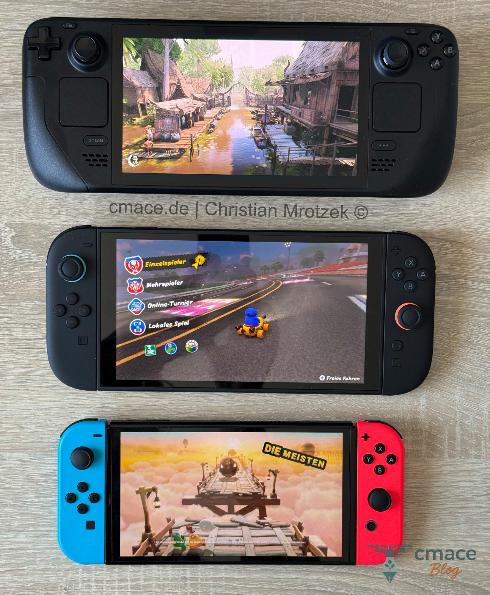 Direkter Vergleich der drei beliebten Handheld-Konsolen: Oben das Steam Deck, in der Mitte die Nintendo Switch 2 und unten die Nintendo Switch OLED (erste Generation). Das Bild zeigt die Unterschiede in Größe, Design, Display und Ergonomie auf einen Blick – ideal für alle, die sich zwischen den aktuellen Handhelds entscheiden möchten oder einfach neugierig auf die Entwicklung der Geräte sind.
