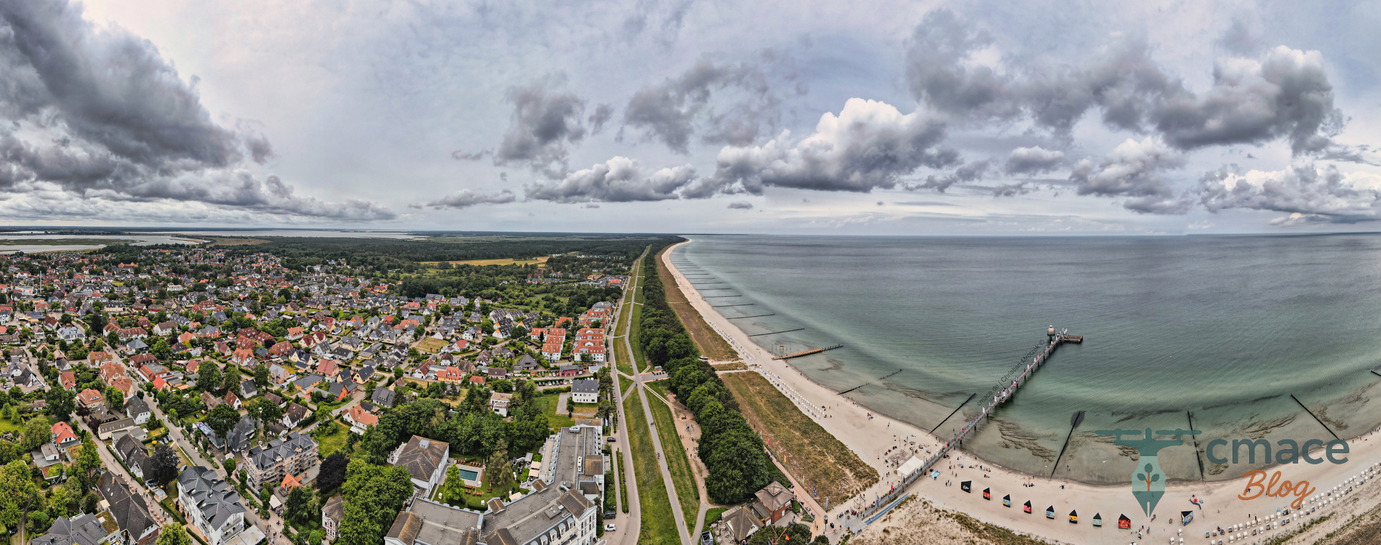 Diese beeindruckende Luftaufnahme zeigt den beliebten Ostseeort Zingst im Juni 2025. Zu sehen sind die weitläufige Küstenlinie, der feine Sandstrand mit der markanten Seebrücke und die angrenzende Bebauung des Ortes. Die Wolkenstimmung und das ruhige Meer verleihen dem Bild eine besondere Atmosphäre, die den Charme der Halbinsel Fischland-Darß-Zingst perfekt einfängt.
