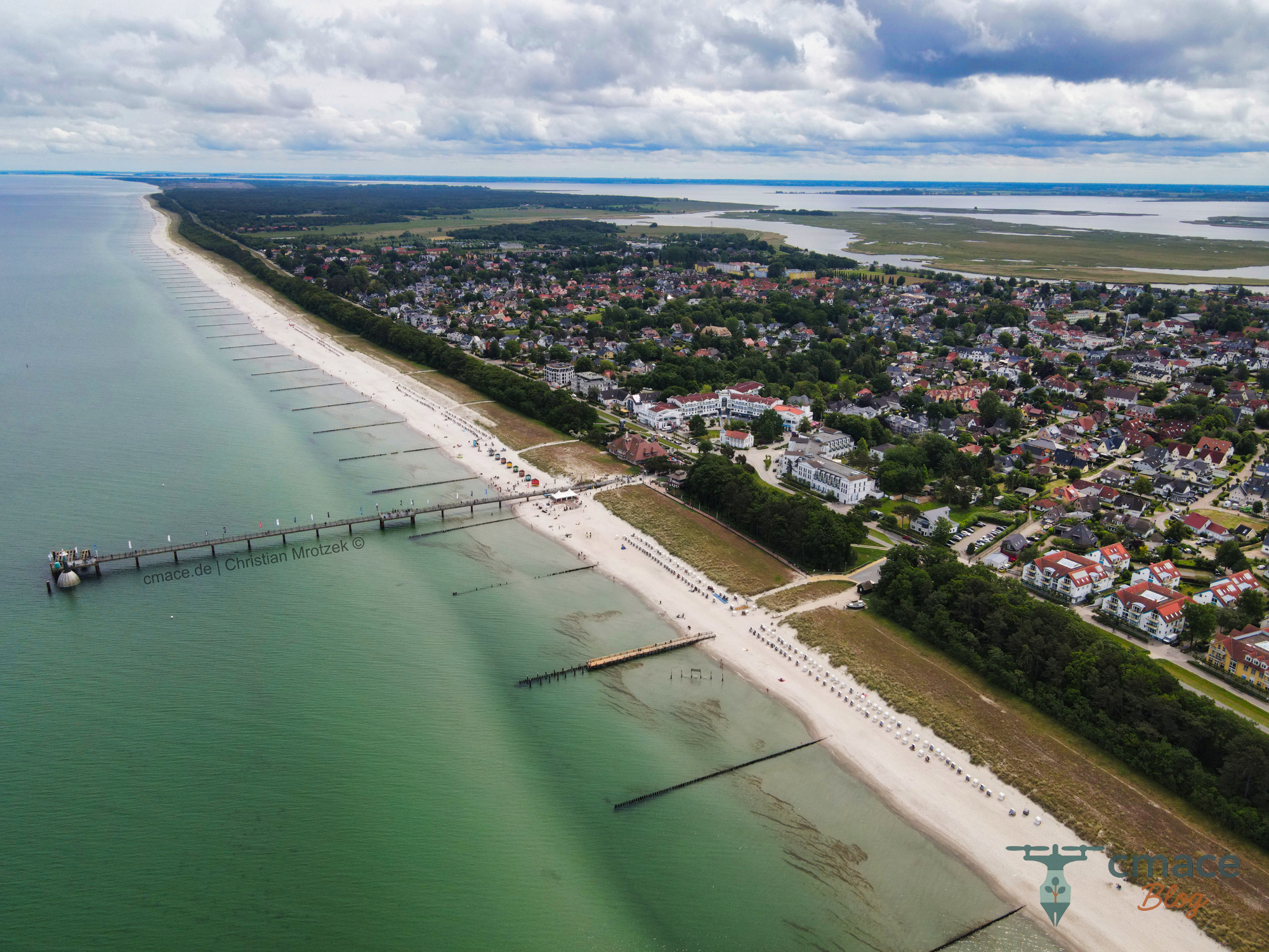 Diese Luftaufnahme zeigt die Seebrücke von Zingst und die weitläufige Ostseeküste im Juni 2025. Der Blick erstreckt sich über den feinen Sandstrand, das grüne Wasser und die angrenzende Bebauung des beliebten Urlaubsortes. Die charakteristische Küstenlandschaft und die Wolkenstimmung verleihen dem Bild eine besondere Atmosphäre.