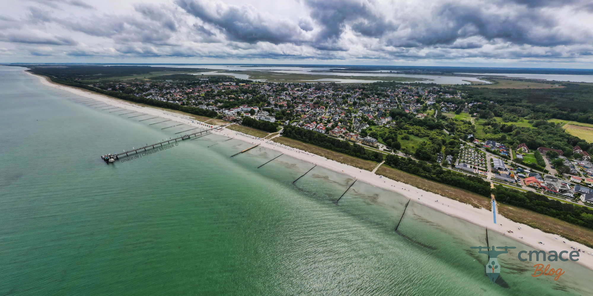 Diese eindrucksvolle Luftaufnahme zeigt die malerische Küstenlinie von Zingst an der Ostsee im Juni 2025. Im Vordergrund ist die bekannte Seebrücke zu sehen, die sich weit ins türkisgrüne Meer erstreckt. Der feine Sandstrand, die typischen Buhnen und die weite Bebauung des Ortes werden von einer dramatischen Wolkenstimmung eingerahmt. Im Hintergrund sind die Boddenlandschaften der Halbinsel Fischland-Darß-Zingst erkennbar.