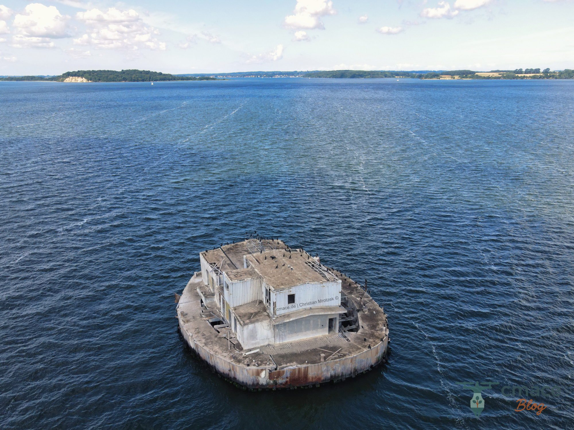 Das Drohnenbild zeigt die eindrucksvolle, verfallene Entmagnetisierungsstation der ehemaligen Volksmarine der DDR im Greifswalder Bodden. Auf einer künstlichen Plattform, gegründet auf hunderten alter Holzpfähle, ragen die Überreste der einst streng geheimen technischen Einrichtung mitten aus dem Wasser zwischen Rügen und dem Festland. Ursprünglich diente der Bau dazu, Magnetfelder von Kriegsschiffen zu neutralisieren und sie so vor Magnetminen zu schützen. Heute ist das Relikt ein beliebtes Fotomotiv, Sinnbild vergangener Militärtechnik und Heimat für zahlreiche Seevögel. Der zunehmend sichtbare Verfall unterstreicht die besondere Atmosphäre dieses Lost Places auf dem Meer.