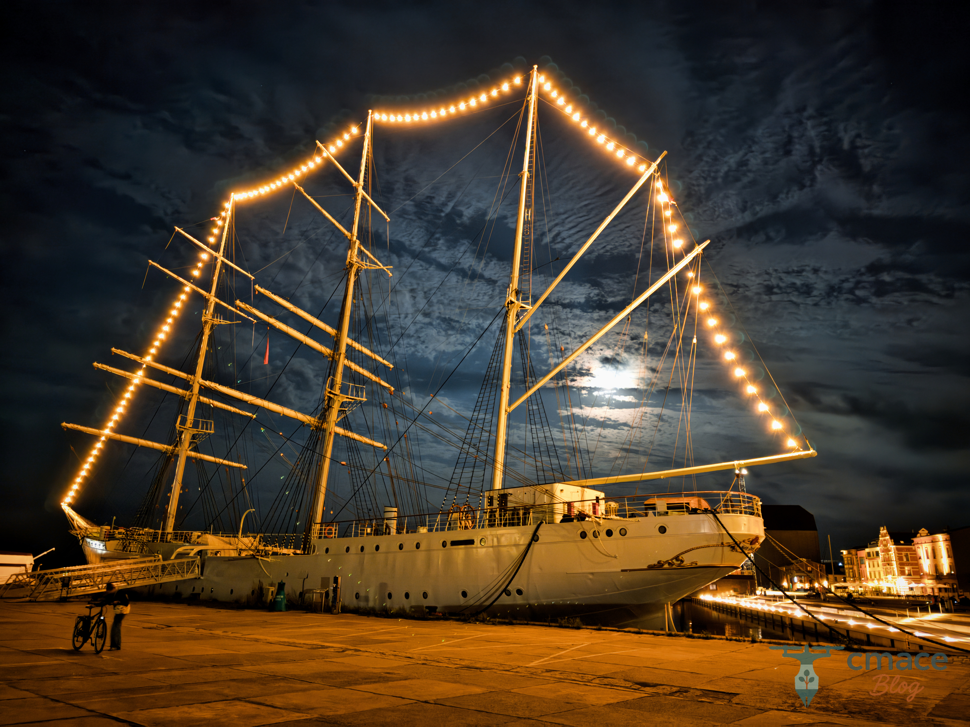 Das Foto zeigt die Gorch Fock I in Stralsund in der Nacht vom letzten Samstag auf Sonntag. Das historische Segelschiff liegt imposant und festlich illuminiert am Kai, während im Hintergrund die Hafeninsel mit ihren Gebäuden hell erstrahlt. Der Nachthimmel mit vereinzelten Wolken und der geheimnisvollen Mondbeleuchtung sorgt für eine besondere Atmosphäre und ein maritimes Flair.