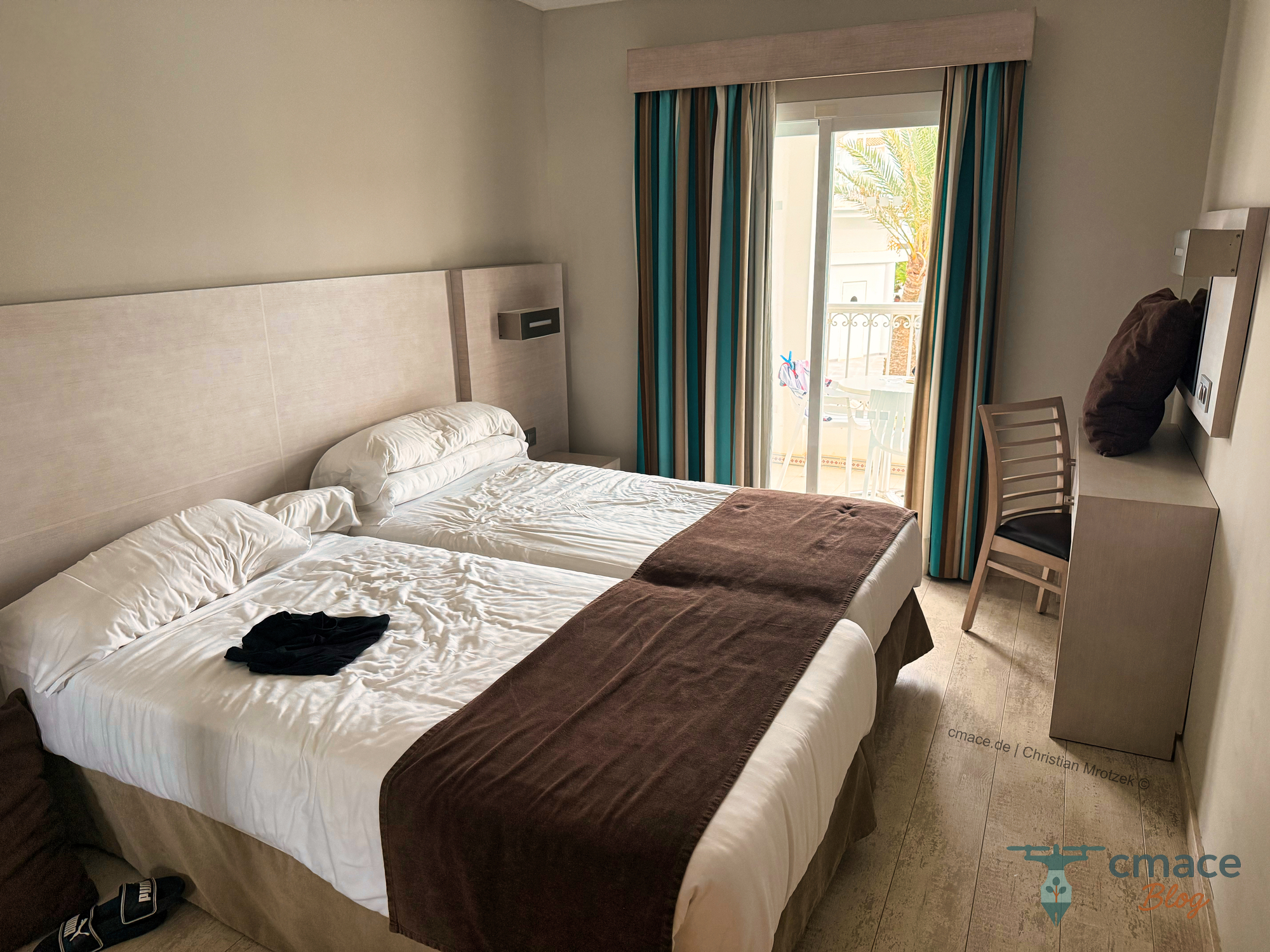 Gemütliches Schlafzimmer mit zwei Einzelbetten, hellem Boden und Zugang zum Balkon. Einfache, saubere Einrichtung mit Blick auf Pool und Grünanlage.