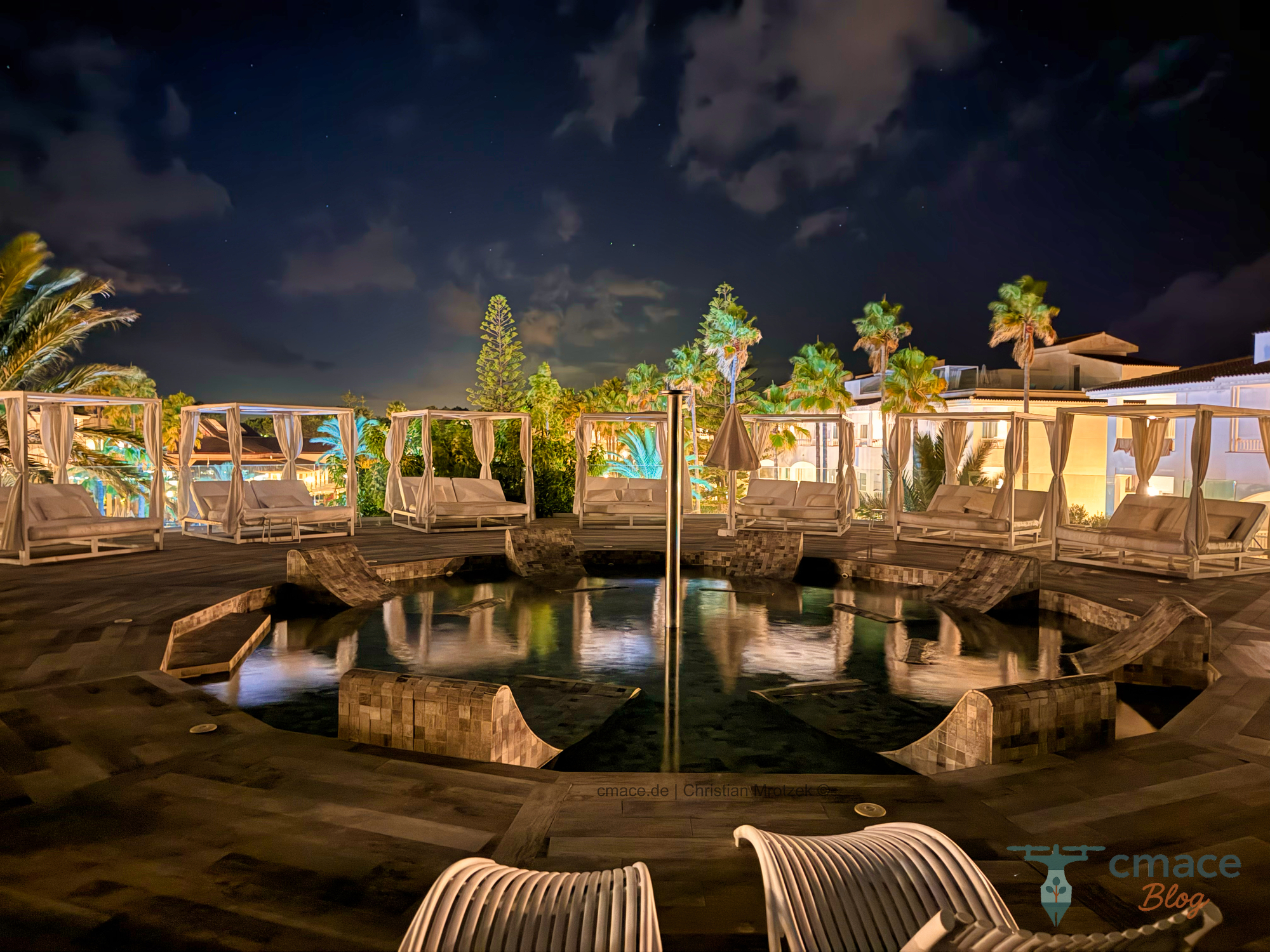Die exklusive Dachterrasse („Selected Service“) des Hotels strahlt in dezenter Beleuchtung. Bequeme Daybeds umgeben einen dekorativen Wasserbrunnen und bieten Blick in den nächtlichen Himmel – ideal für Ruhesuchende, wenn nicht gerade die Familienbars unten laut sind.