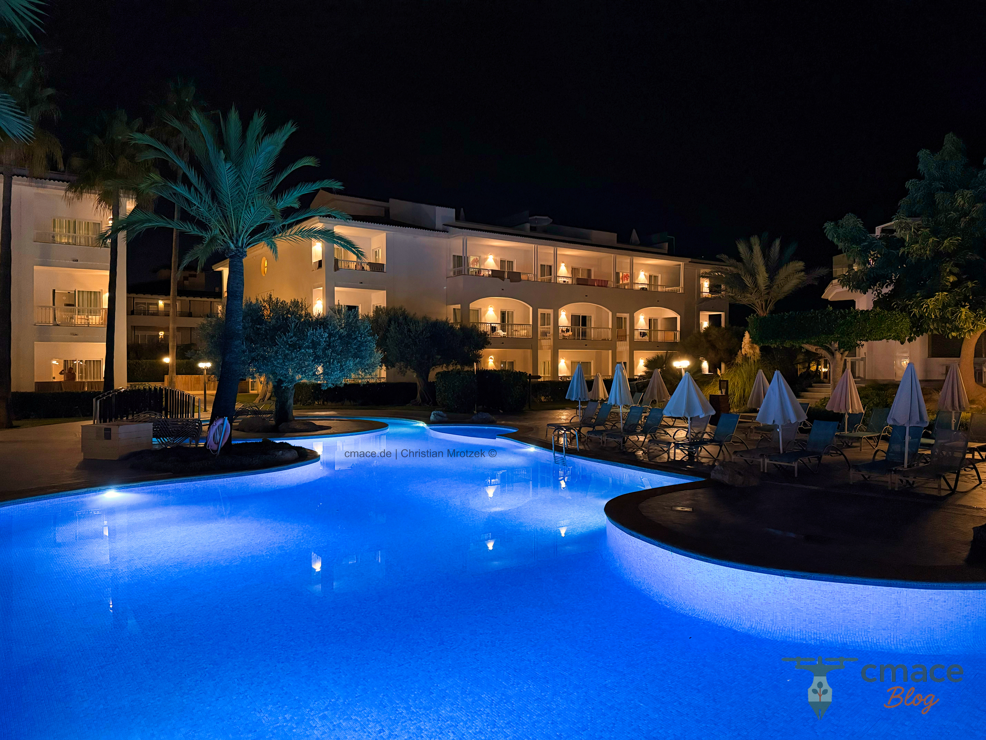 Die stilvoll beleuchtete Poolanlage des Playa Garden Selection in der Dämmerung. Sanfte Lichter tauchen das Wasser in ein warmes Blau und schaffen eine einladende Atmosphäre zum Entspannen.