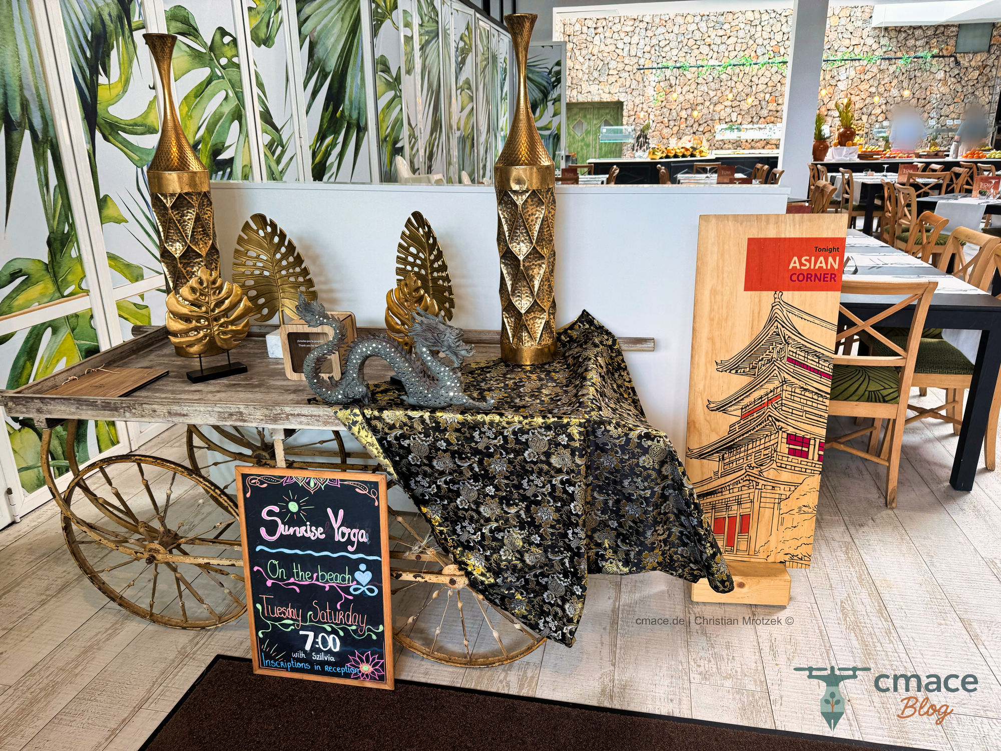 Der Eingangsbereich des Hauptrestaurants mit dekorativem Rollwagen und Aufsteller für Themenabende (z.B. „Asian Corner“). Solche Hingucker sollen Besucher leiten.