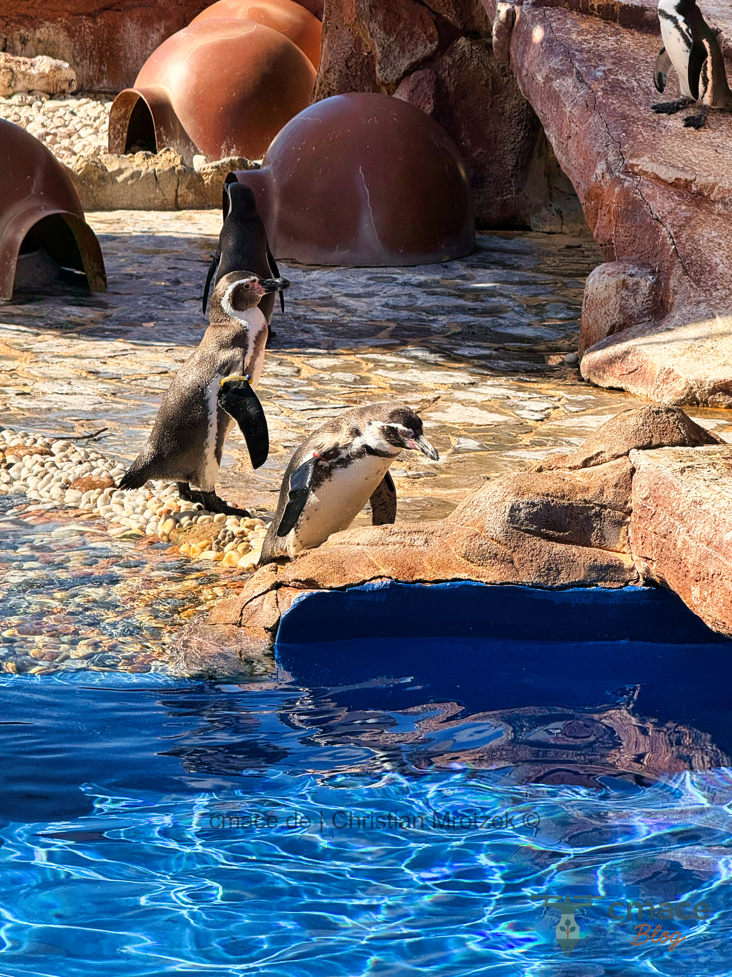 Drei junge Humboldt-Pinguine stehen am Beckenrand und beobachten das glitzernde Wasser. Im Hintergrund sind die charakteristischen Kokons zu sehen, in denen sich die Vögel zurückziehen können.