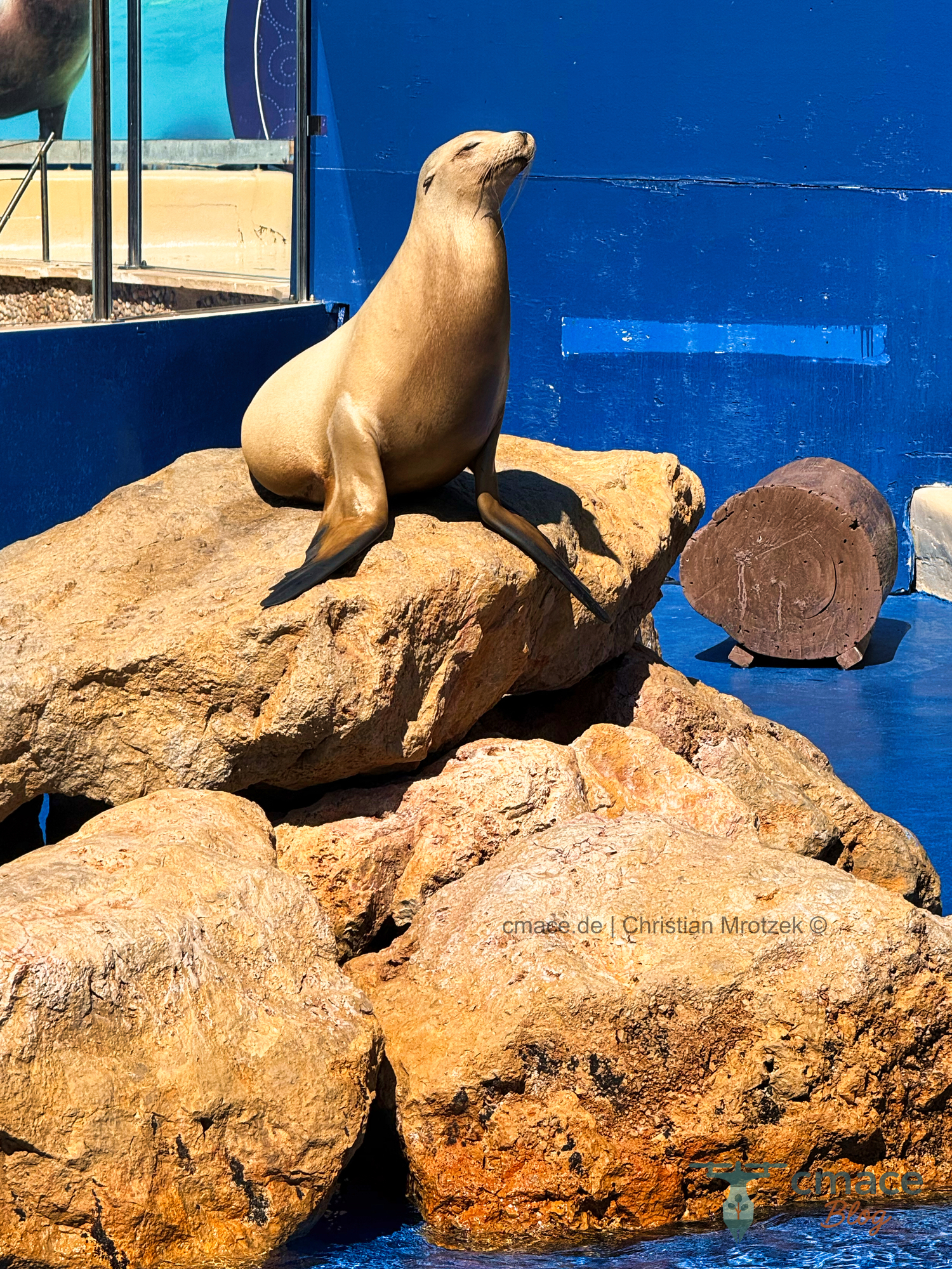 Ein Seelöwe liegt entspannt auf einem hellen Felsen in der Sonne und genießt die warmen Strahlen im Marineland Mallorca. Die ruhige Pose vermittelt Gelassenheit und die rote Felskulisse schafft eine natürliche Atmosphäre.
