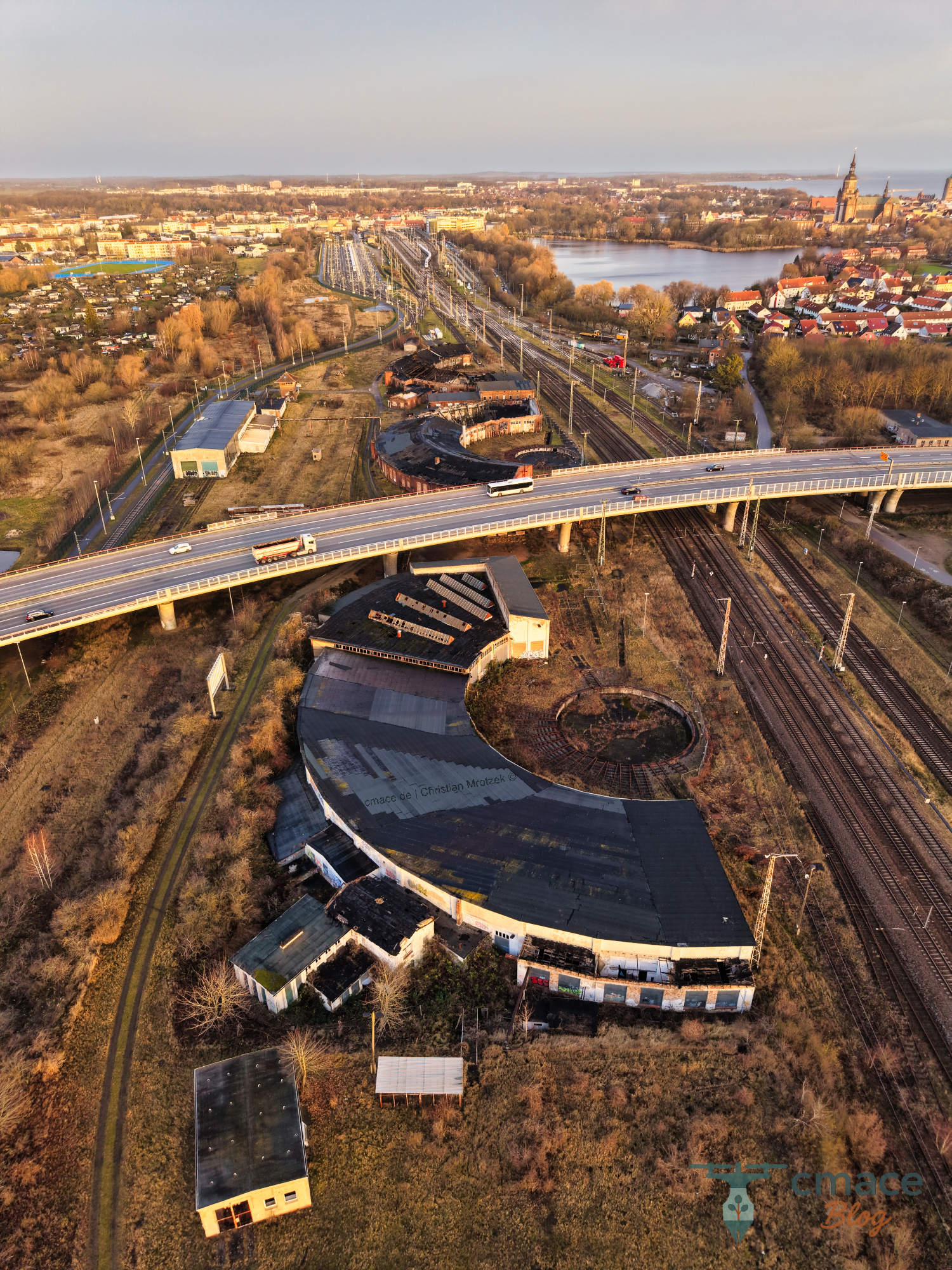 Dieses beeindruckende Luftbild zeigt den ehemaligen Lokschuppen Stralsund aus einer faszinierenden Perspektive. Die charakteristische Rundform der Lokschuppen-Halle wird hier besonders deutlich sichtbar, überlagert von der modernen Autobahnbrücke. Das Bild dokumentiert eindrucksvoll den Kontrast zwischen der historischen Eisenbahninfrastruktur und der modernen Verkehrsanbindung. Gleisanlagen, verfallende Nebengebäude und die langsam verschwindende Vegetation zeigen den aktuellen Zustand dieses bedeutsamen Industriedenkmals.
