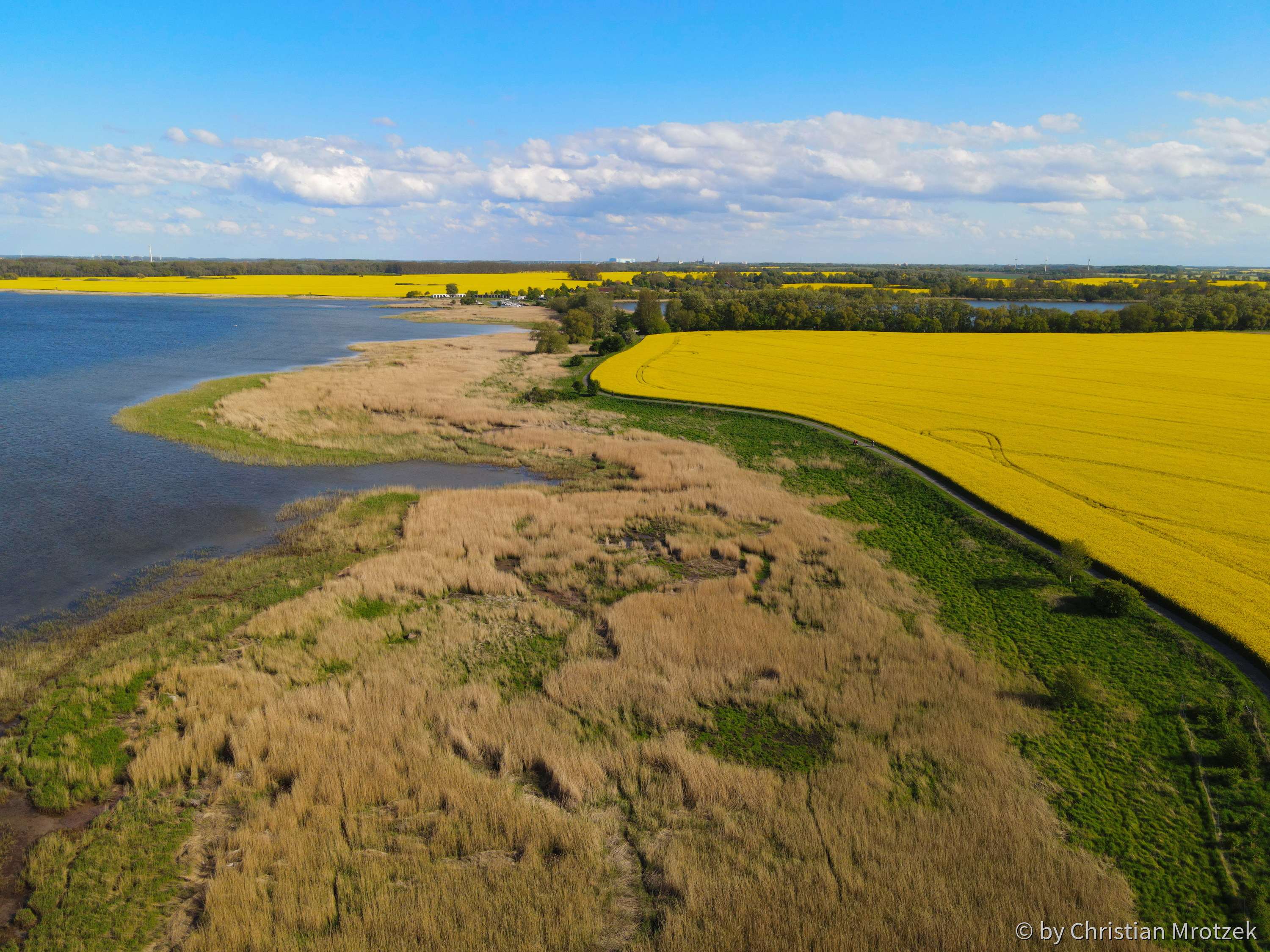 Links der Strelasund, mittig ein Wander- und Radweg, rechts ein Rapsfeld in voller Blüte.