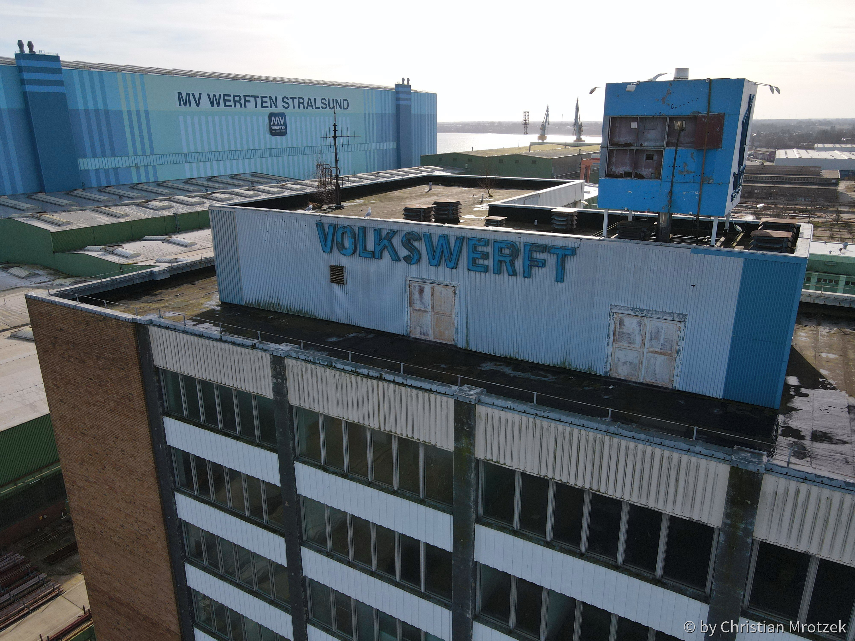 Das ehemalige Verwaltungsgebäude im Vordergrund mit dem "Volkswerft" Schriftzug und der Werfthalle mit dem "MV Werften" Schriftzug.