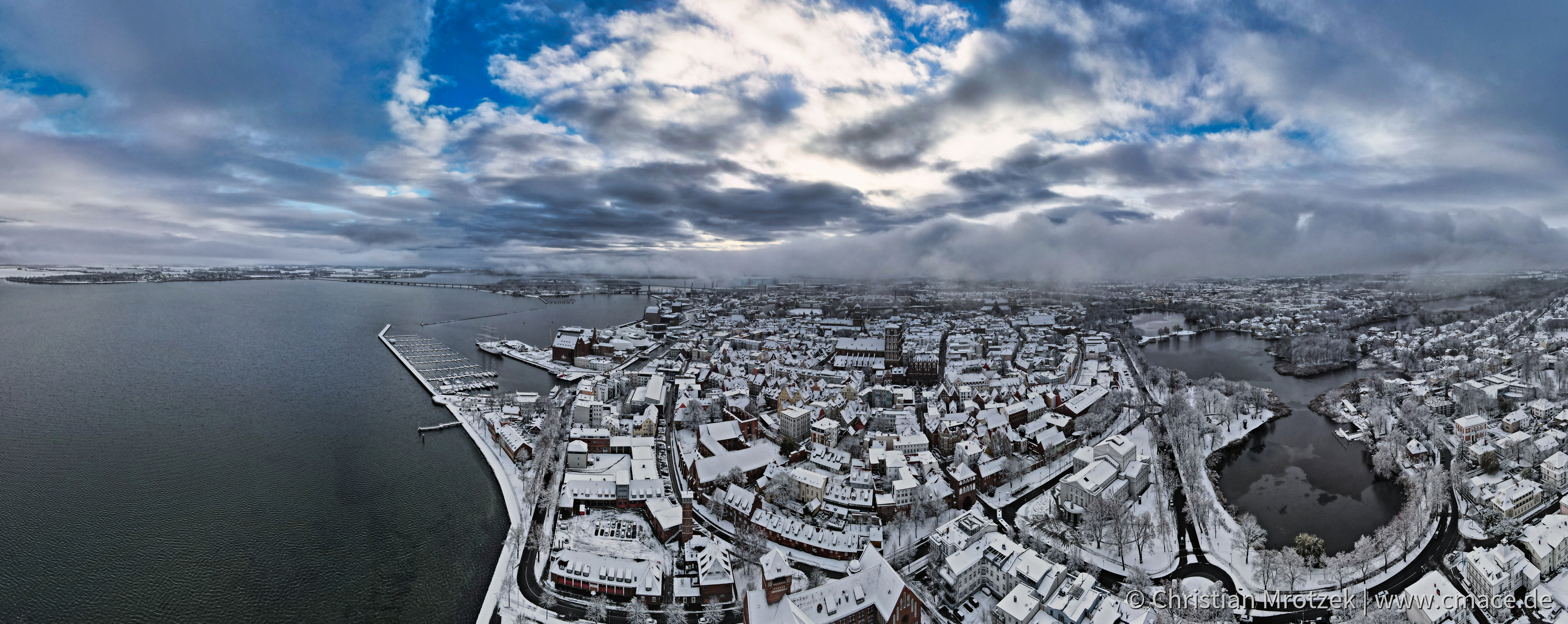 Diese Fotografie aus der Luft zeigt Stralsund nach dem ersten Schneefall im Dezember 2022.