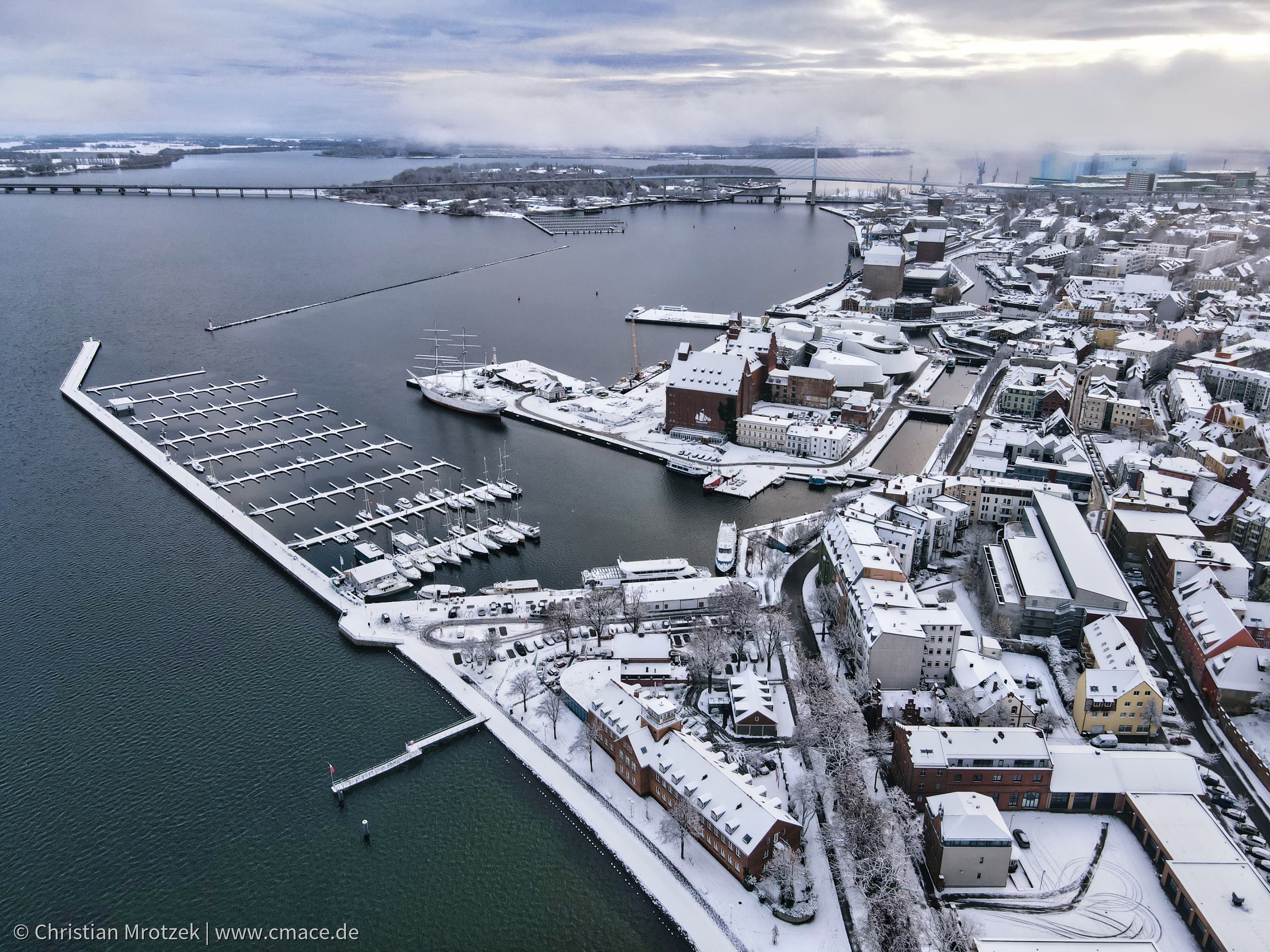 Diese Fotografie zeigt im Vordergrund den Hafen und die Hafeninsel in Stralsund im Winter 2022 aus der Luft.