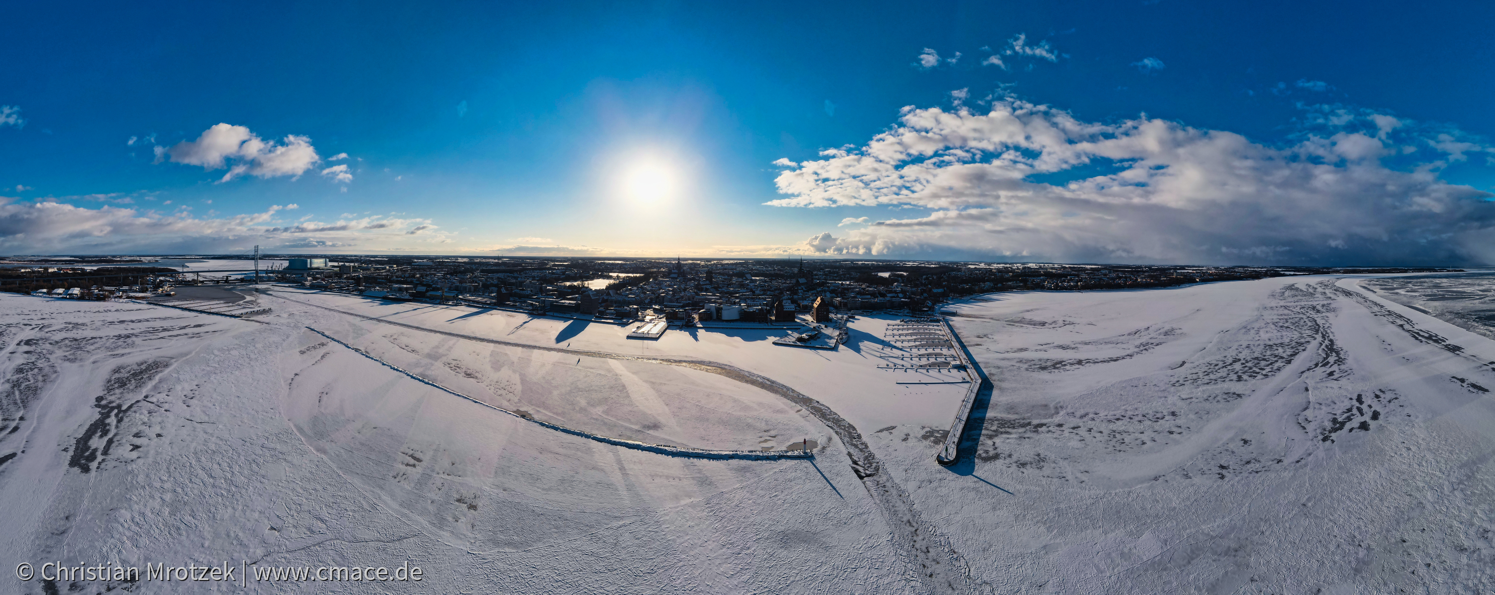 Zu sehen ist der Hafen und die Hafeninsel in Stralsund im Winter. Im Vordergrund ist der Strelasund mit der schneebedeckten Eisdecke zu sehen.