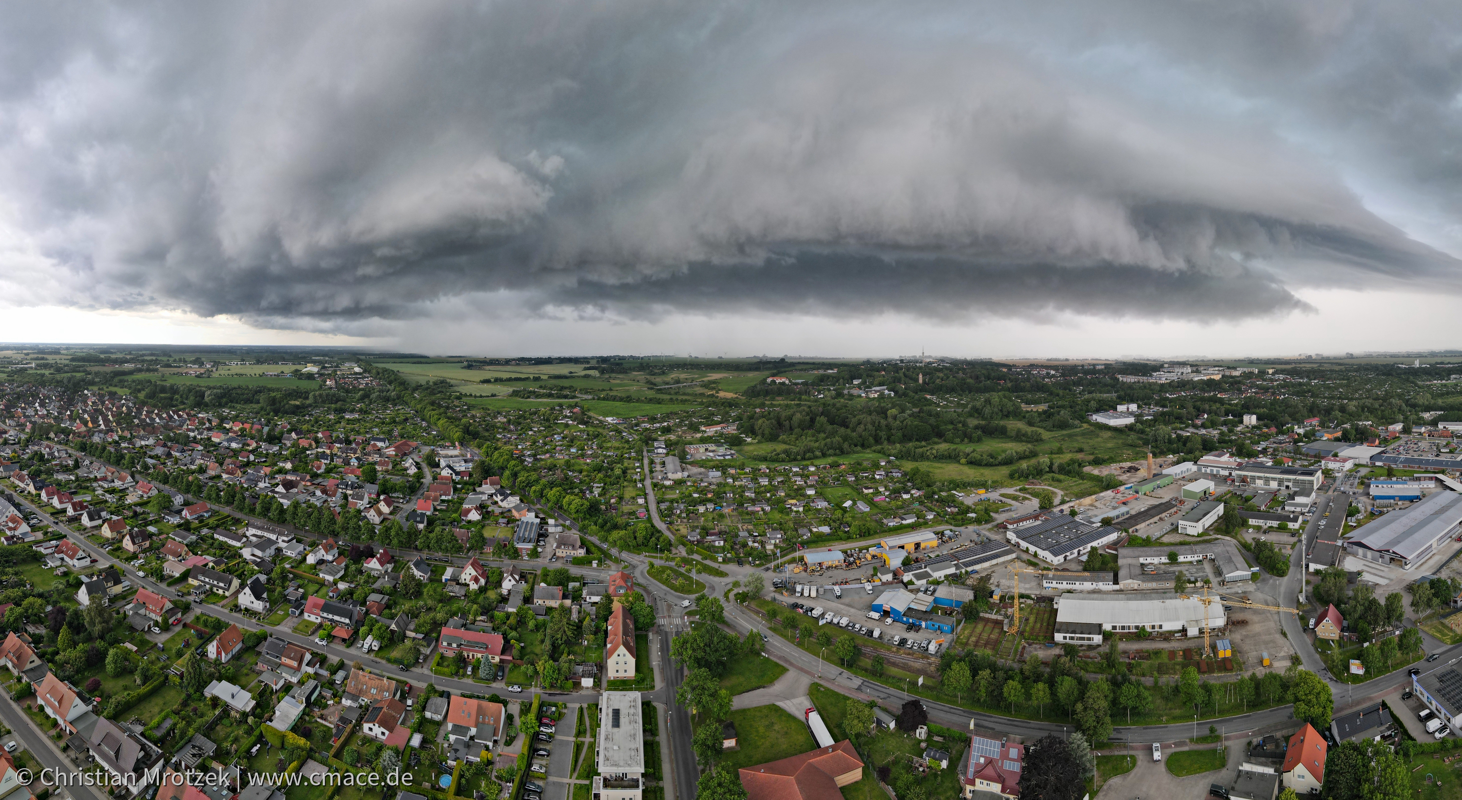 Am 17. Juni 2024 zog eine riesige Regenwolke auf Stralsund zu. In kurzer Zeit machte ich meine Drohne startklar, um dieses Naturschauspiel aus der Luft festzuhalten, bevor es über mich hinwegfegte. Nach einigen Fotos und einem Video landete ich die Drohne wieder rechtzeitig, bevor der Regenschauer und das Gewitter über mir waren.