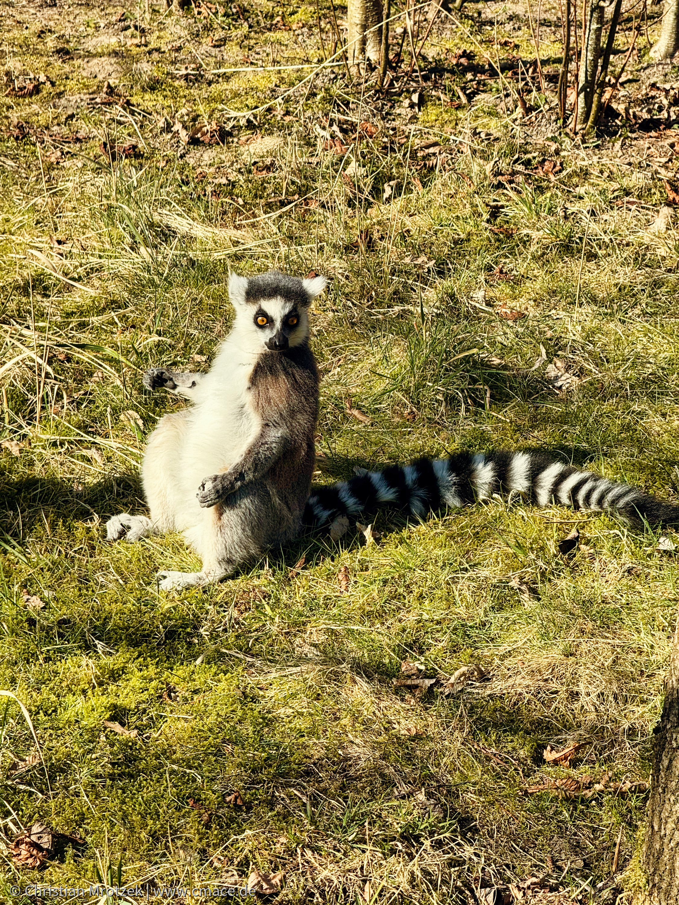 Ein charismatischer Katta (Lemur catta) genießt die Frühlingssonne im Vogelpark Marlow. Mit seinem aufrechten Sitz und dem aufmerksam gerichteten Blick scheint er die Umgebung genau zu beobachten. Der markante schwarz-weiß geringelte Schwanz und das flauschige Fell machen ihn zu einem faszinierenden Anblick inmitten der natürlichen Graslandschaft des Parks.