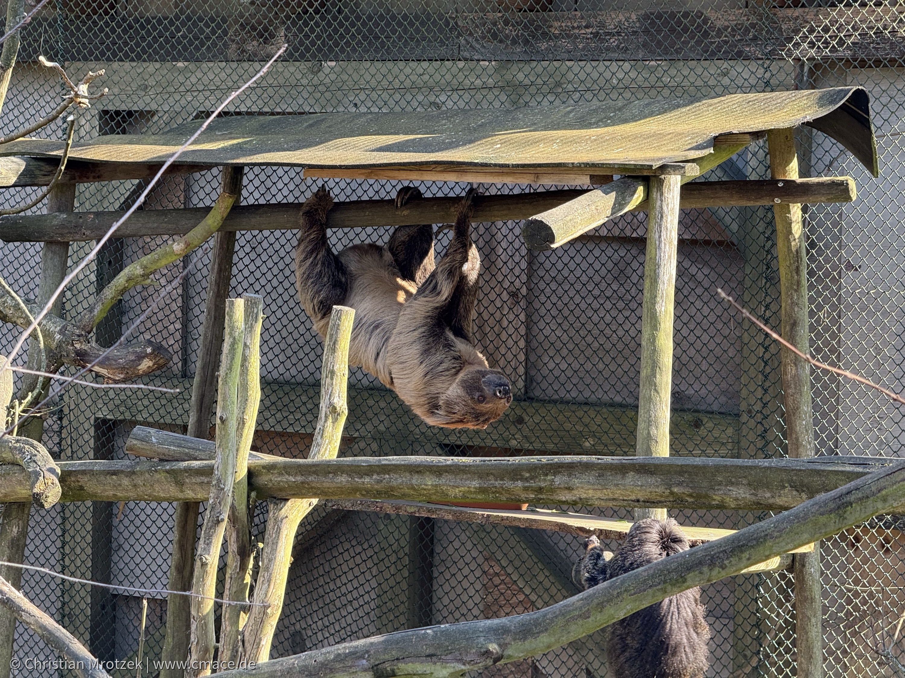 Ein gemütliches Zweifingerfaultier (Choloepus didactylus) hängt entspannt kopfüber an einem Holzbalken im Vogelpark Marlow. Die friedliche Szene zeigt das Faultier in seiner typischen Haltung, perfekt angepasst an das Leben in den Bäumen. Im Hintergrund ist das Gehege zu erkennen, das eine natürliche und geschützte Umgebung für diese faszinierenden Tiere bietet.