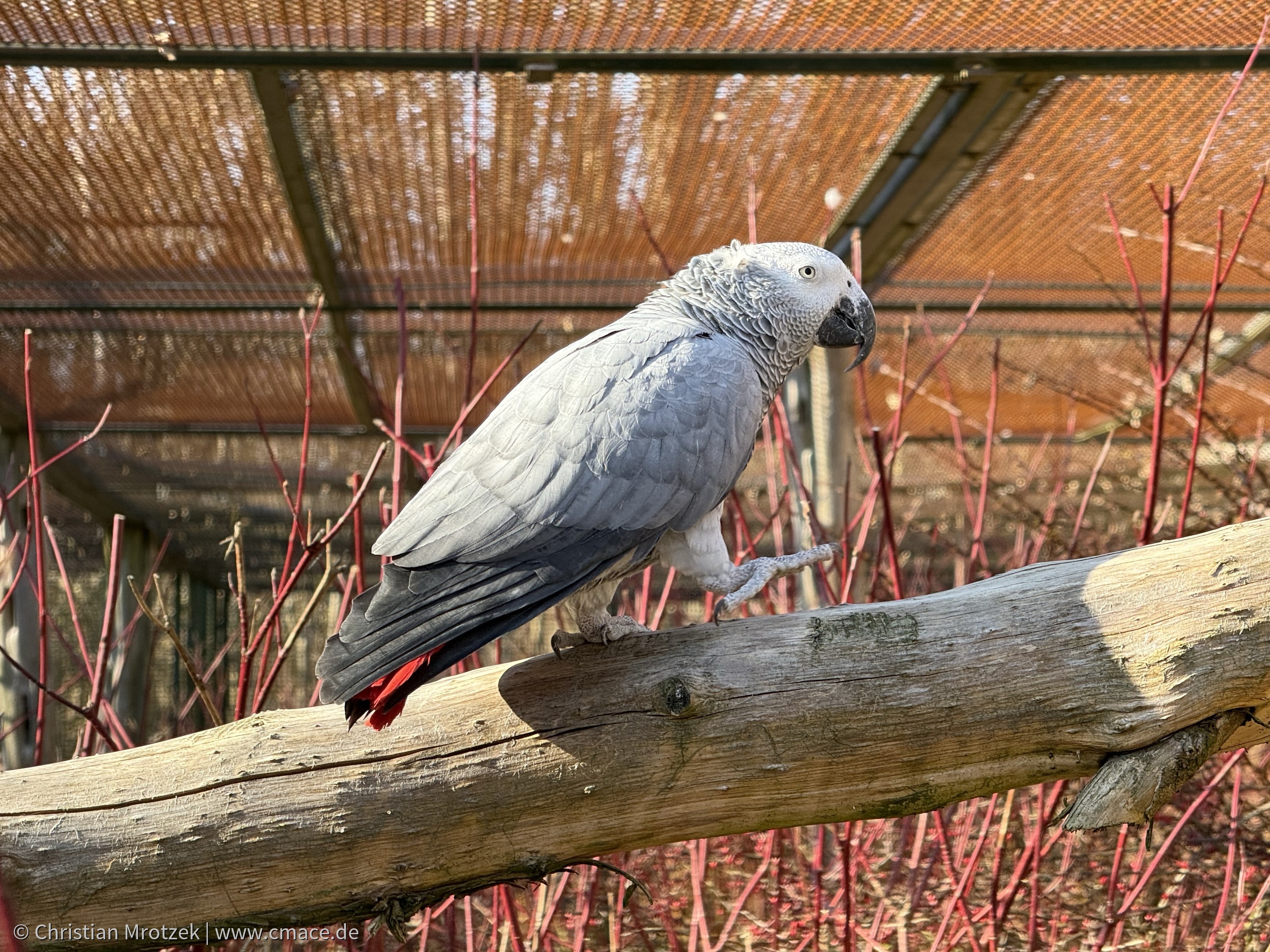 Ein eleganter Graupapagei (Psittacus erithacus) balanciert geschickt auf einem Holzstamm im Vogelpark Marlow. Sein silbergraues Gefieder mit dem markanten roten Schwanz leuchtet im Sonnenlicht, während die roten Zweige im Hintergrund eine harmonische Farbkombination schaffen. Diese Szene zeigt den Papagei in einer natürlichen und lebendigen Umgebung, die seine Intelligenz und Neugierde widerspiegelt.