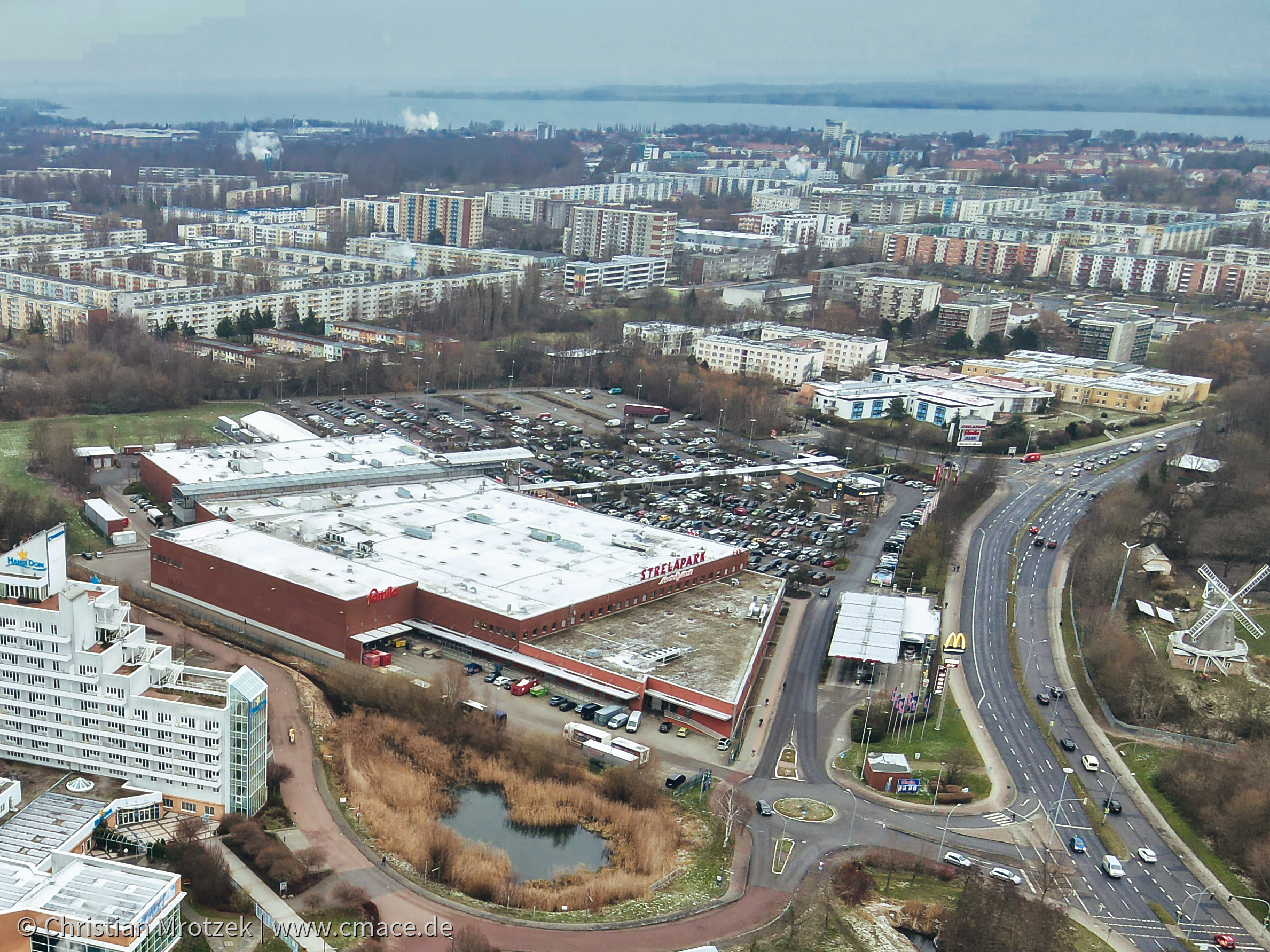 Die winterliche Atmosphäre wird durch die kahlen Bäume am Rand des Geländes betont. Im Umfeld sind weitere Gewerbegebäude und Wohnblocks zu erkennen, die den Strelapark umgeben. Besonders auffällig ist, dass die gesamte Fläche vor dem Hauptgebäude noch als Parkplatz genutzt wird - genau jener Bereich, der im späteren Erweiterungsprojekt bebaut werden sollte. Die Aufnahme dokumentiert somit einen historischen Zustand des Strelaparks, kurz bevor die umfassende Erweiterung um 9.000 Quadratmeter begann, die das Erscheinungsbild des Einkaufszentrums grundlegend verändern würde.
