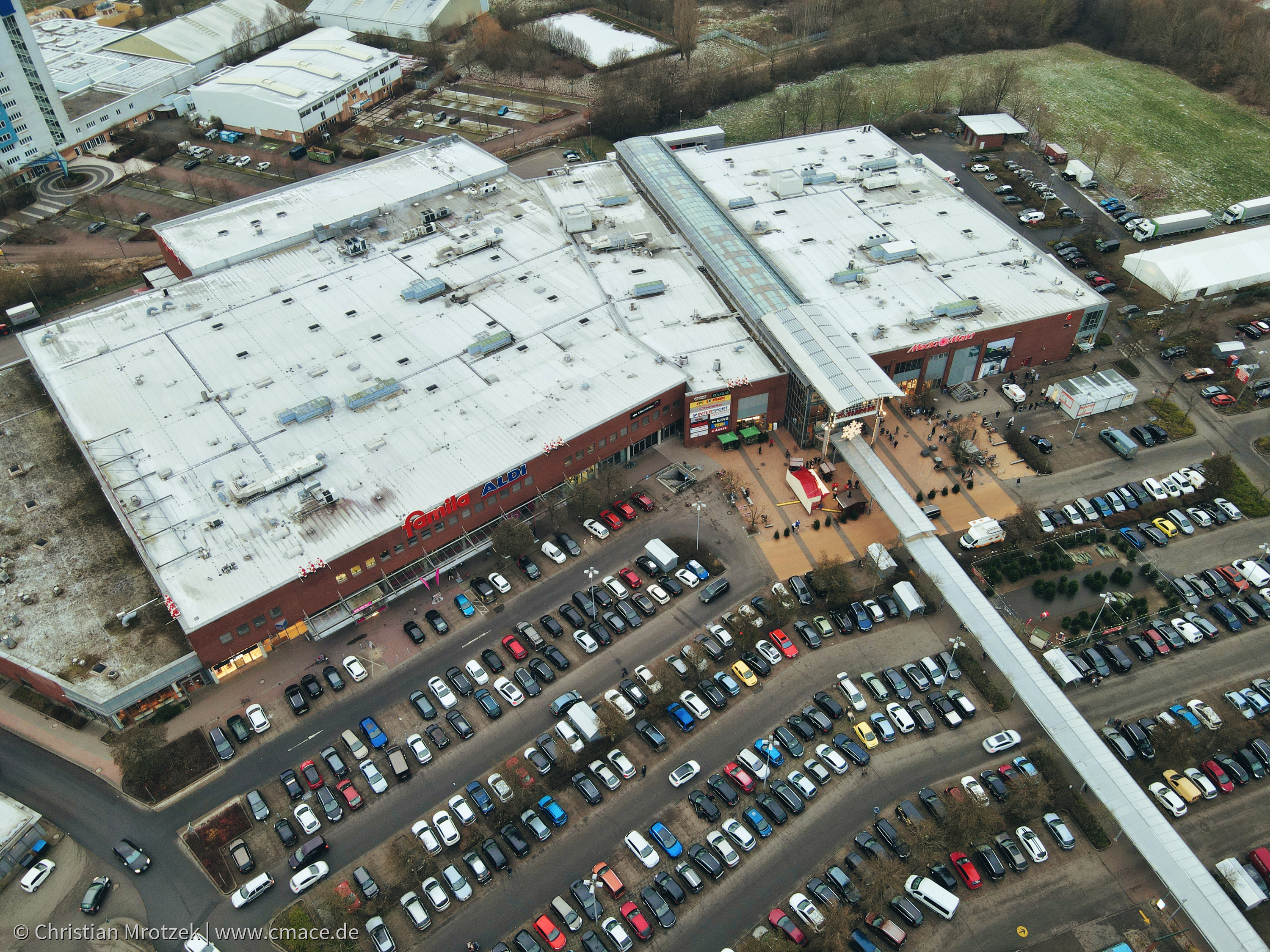 Die winterliche Atmosphäre wird durch die kahlen Bäume am Rand des Geländes betont. Im Umfeld sind weitere Gewerbegebäude und Wohnblocks zu erkennen, die den Strelapark umgeben. Besonders auffällig ist, dass die gesamte Fläche vor dem Hauptgebäude noch als Parkplatz genutzt wird - genau jener Bereich, der im späteren Erweiterungsprojekt bebaut werden sollte. Die Aufnahme dokumentiert somit einen historischen Zustand des Strelaparks, kurz bevor die umfassende Erweiterung um 9.000 Quadratmeter begann, die das Erscheinungsbild des Einkaufszentrums grundlegend verändern würde.