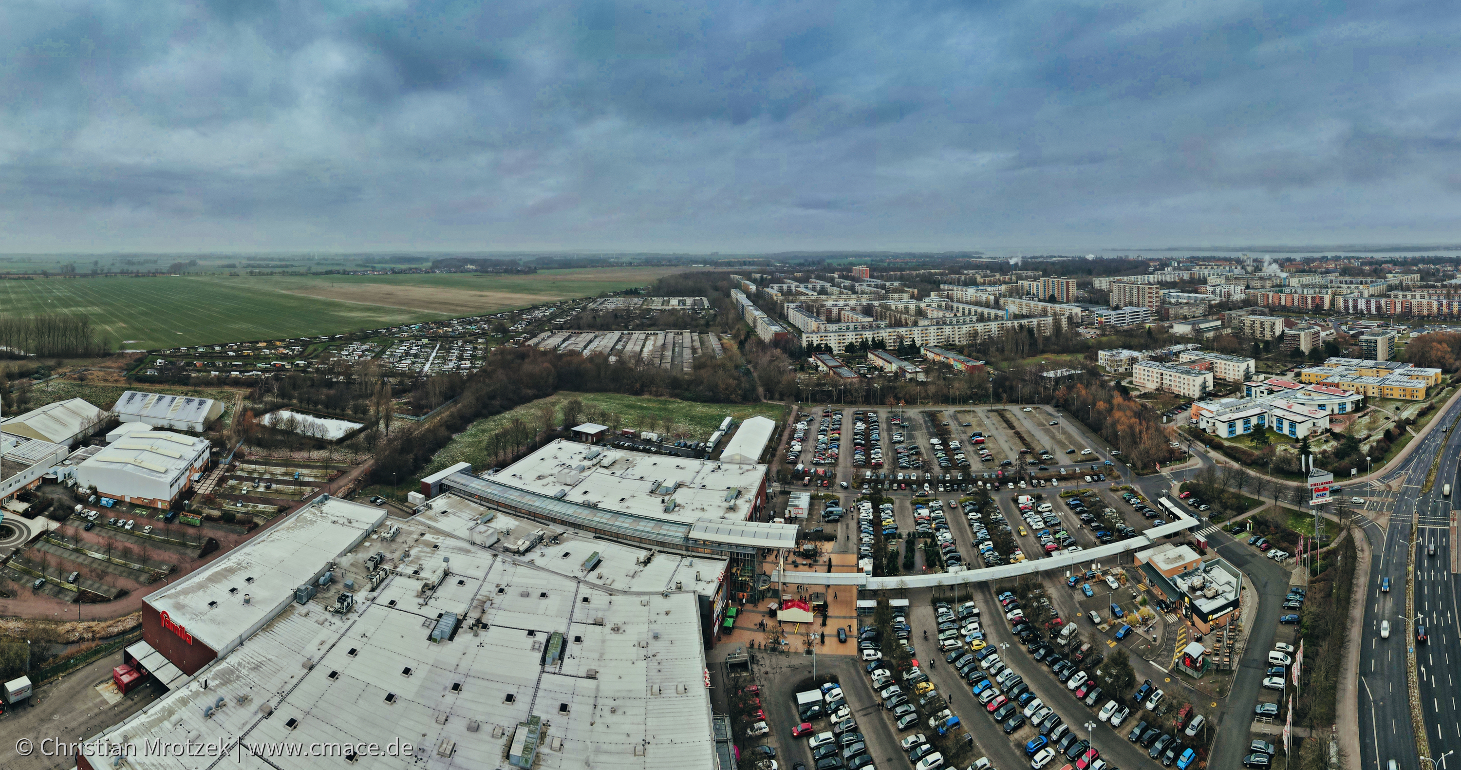 Die Drohnenaufnahme zeigt den Strelapark in Stralsund aus der Vogelperspektive im Dezember 2021. Deutlich erkennbar ist das weitläufige Einkaufszentrum mit seinem charakteristischen flachen Dach, das den zentralen Teil des Bildes dominiert. Der großzügige Parkplatz ist gut gefüllt mit bunten Fahrzeugen, die in geordneten Reihen stehen und auf die damalige rege Nutzung des Einkaufszentrums hinweisen.