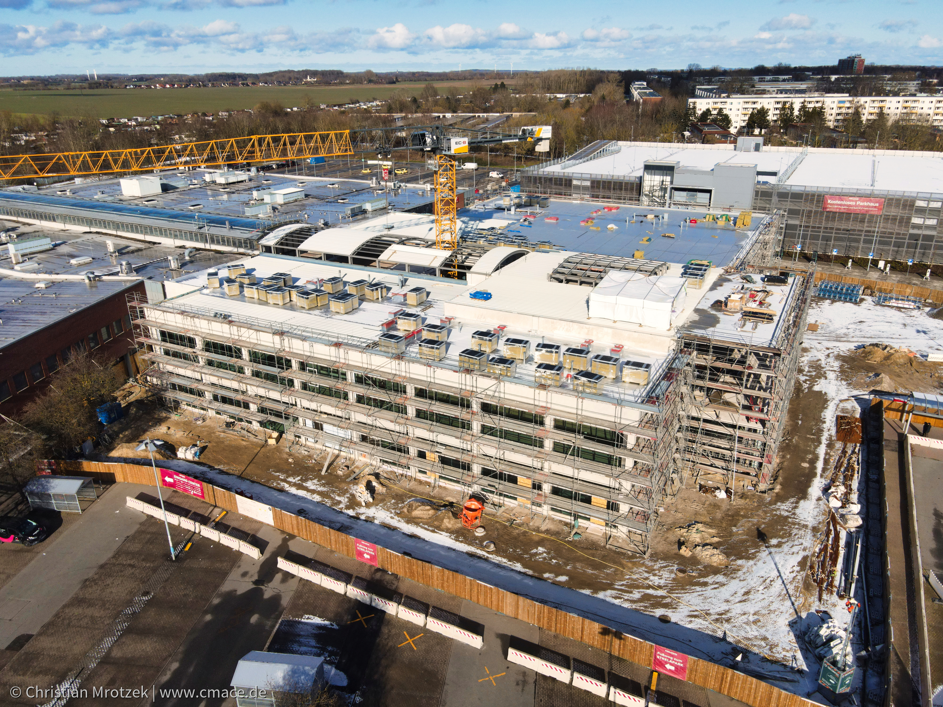 Diese Luftaufnahme dokumentiert eindrucksvoll den Fortschritt des 65-Millionen-Euro-Projekts, das dem Strelapark weitere 9.000 m² Verkaufsfläche hinzufügen wird und im Herbst 2025 fertiggestellt sein soll.