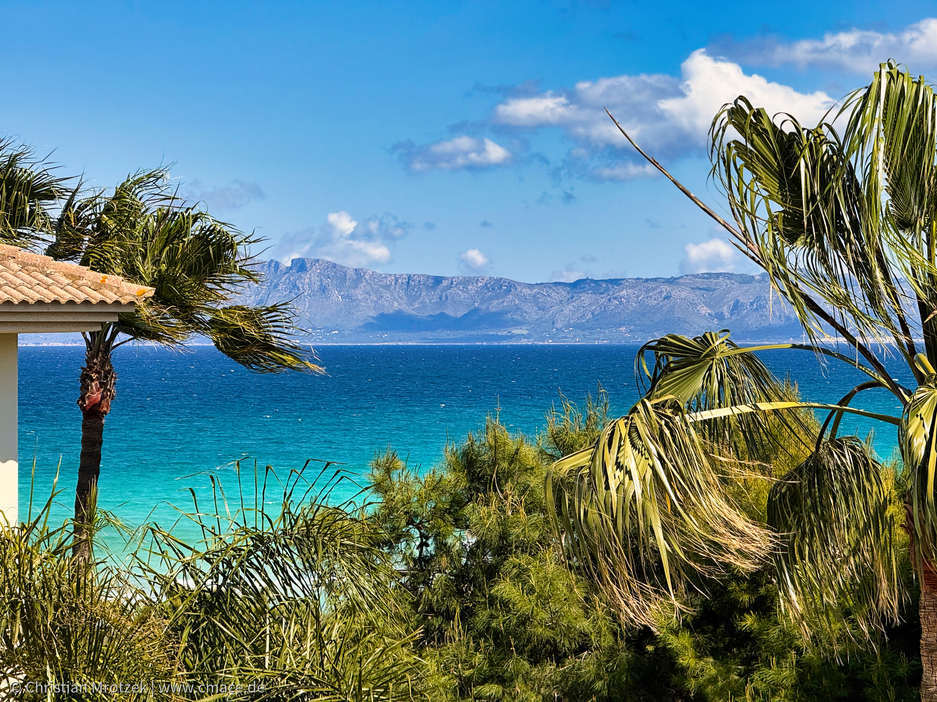 Der Blick vom Balkon unseres Zimmers im Grupotel Parc Natural & Spa zeigt das türkisfarbene Meer, eingerahmt von Palmen und mediterraner Vegetation. Durch die Bäume und das Hoteldach hindurch eröffnet sich ein malerischer Ausblick auf das Wasser und die Berge am Horizont – ein kleiner, aber wunderschöner Meerblick, der Urlaubsstimmung garantiert.