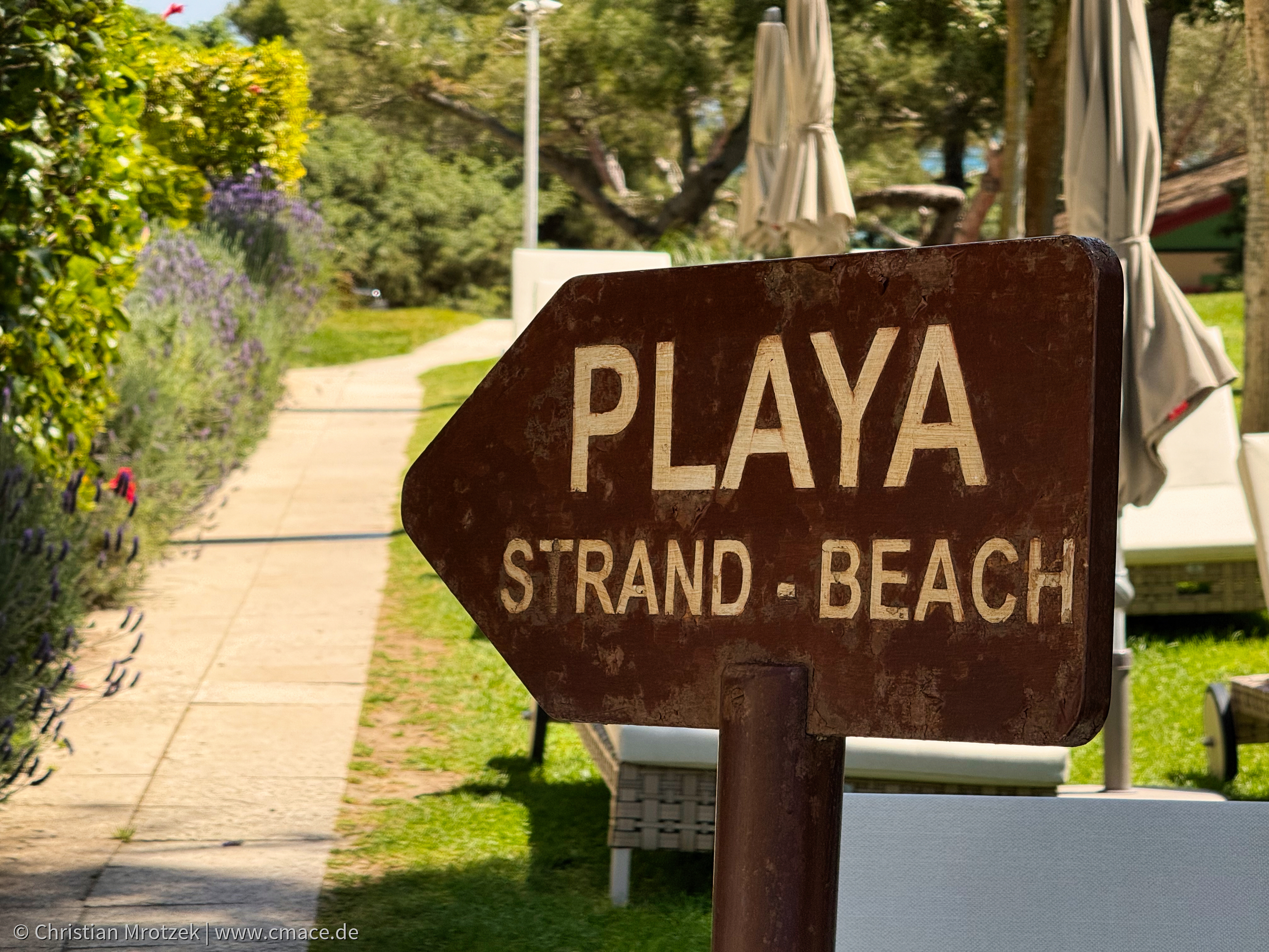 Ein rustikales Schild mit der Aufschrift „Playa / Strand / Beach“ weist im Garten des Grupotel Parc Natural & Spa den direkten Weg zum herrlichen Sandstrand der Playa de Muro. Umgeben von grüner Gartenanlage, Lavendel und gemütlichen Liegen beginnt hier der kurze Spaziergang zum Meer – Urlaubsstimmung garantiert!