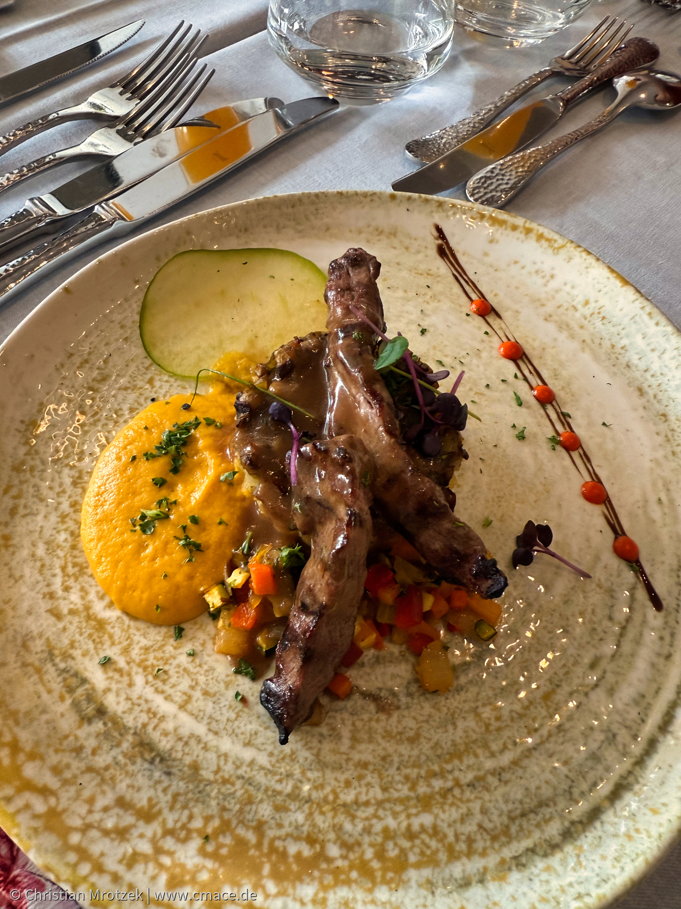 Ein kunstvoll angerichteter Hauptgang vom Abendmenü im Grupotel Parc Natural & Spa: Zarte, gegrillte Lammkoteletts auf einem Bett aus mediterranem Gemüse, begleitet von einem cremigen Püree und dekorativen Saucenakzenten. Die kreative Präsentation und die hochwertige Qualität spiegeln das kulinarische Niveau des Abendbuffets wider, bei dem täglich verschiedene Fleisch-, Fisch- und vegetarische Gerichte frisch zubereitet werden.