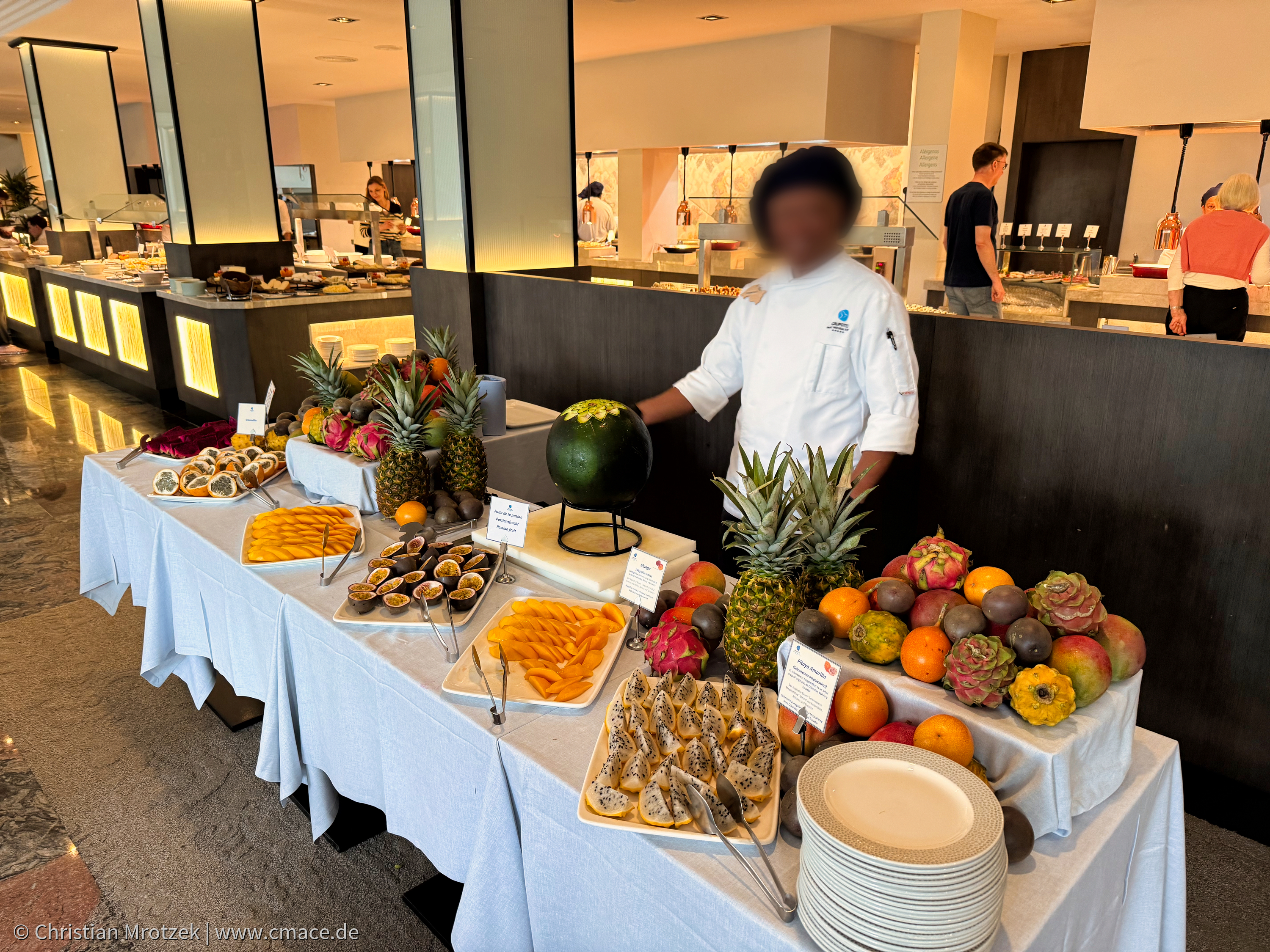 Das farbenfrohe Obstbuffet im Grupotel Parc Natural & Spa begeistert mit einer großen Auswahl an frischen, exotischen Früchten wie Ananas, Mango, Passionsfrucht, Drachenfrucht und Melone. Ein Koch sorgt für die ansprechende Präsentation und steht für Wünsche der Gäste bereit. Die liebevolle Auswahl und das abwechslungsreiche Angebot machen das Buffet zu einem echten Highlight für Genießer und sorgen für einen frischen Start in den Tag.