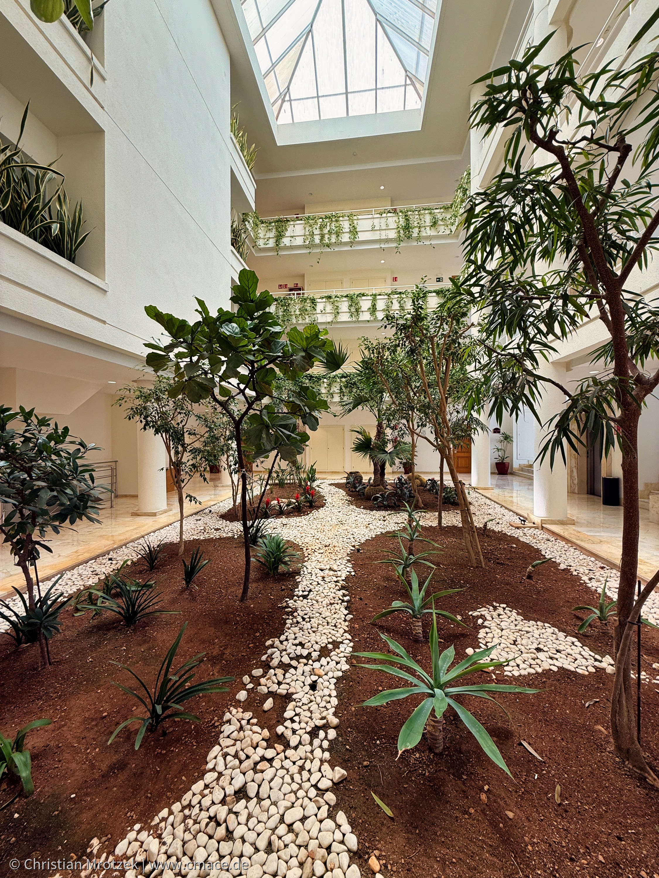 Im lichtdurchfluteten Atrium von Haus 3 des Grupotel Parc Natural & Spa erwartet die Gäste ein wunderschöner Indoor-Garten. Mediterrane Pflanzen, kleine Bäume und Palmen wachsen in sorgfältig angelegten Beeten, durchzogen von weißen Kieselwegen. Die offene Architektur mit Glasdach, hellen Balkonen und viel Tageslicht schafft eine entspannte, natürliche Atmosphäre – ein echtes Highlight der Hotelanlage und ein ruhiger Ort zum Verweilen.