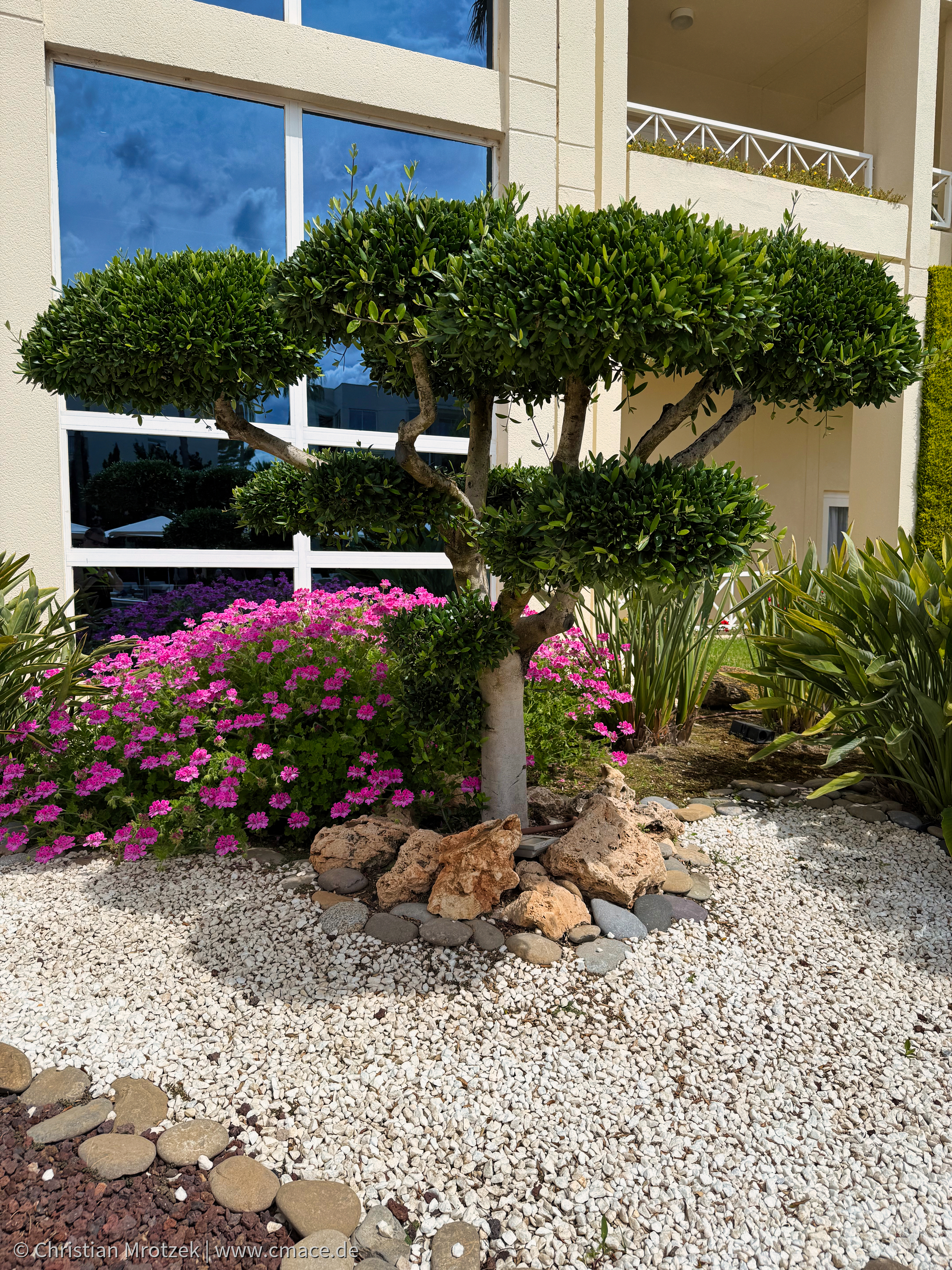 Vor dem Grupotel Parc Natural & Spa steht ein kunstvoll geschnittener mediterraner Baum, umgeben von leuchtend pinken Blumen und dekorativen Steinen. Die harmonisch angelegte Gartenfläche mit weißen Kieseln und Natursteinen spiegelt die Liebe zum Detail und die gepflegte Atmosphäre der Hotelanlage wider. Im Hintergrund sorgen große Fenster und helle Fassaden für ein modernes, einladendes Ambiente.