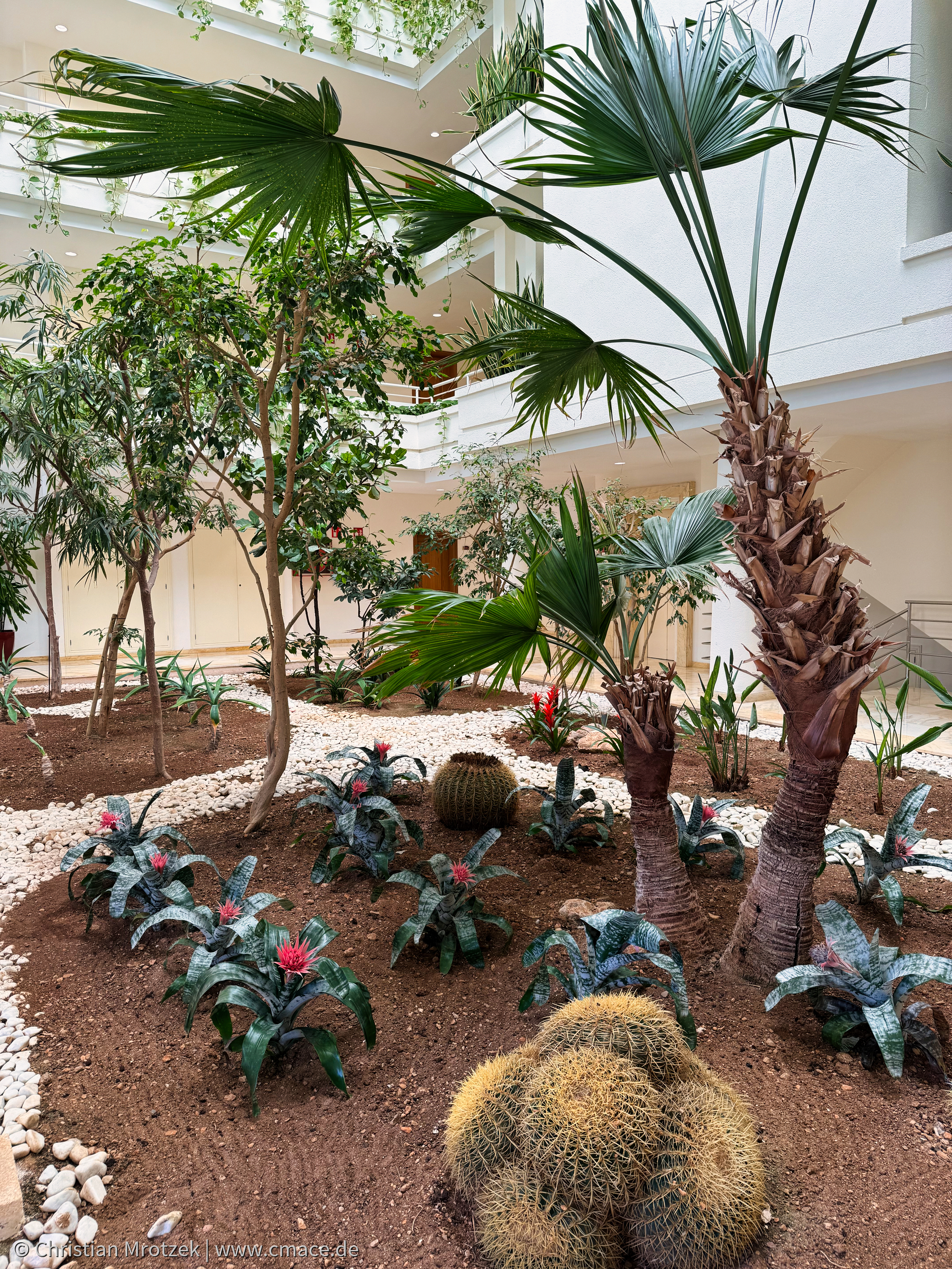Im lichtdurchfluteten Atrium von Haus 3 des Grupotel Parc Natural & Spa erwartet die Gäste ein wunderschöner Indoor-Garten. Mediterrane Pflanzen, kleine Bäume und Palmen wachsen in sorgfältig angelegten Beeten, durchzogen von weißen Kieselwegen. Die offene Architektur mit Glasdach, hellen Balkonen und viel Tageslicht schafft eine entspannte, natürliche Atmosphäre – ein echtes Highlight der Hotelanlage und ein ruhiger Ort zum Verweilen.