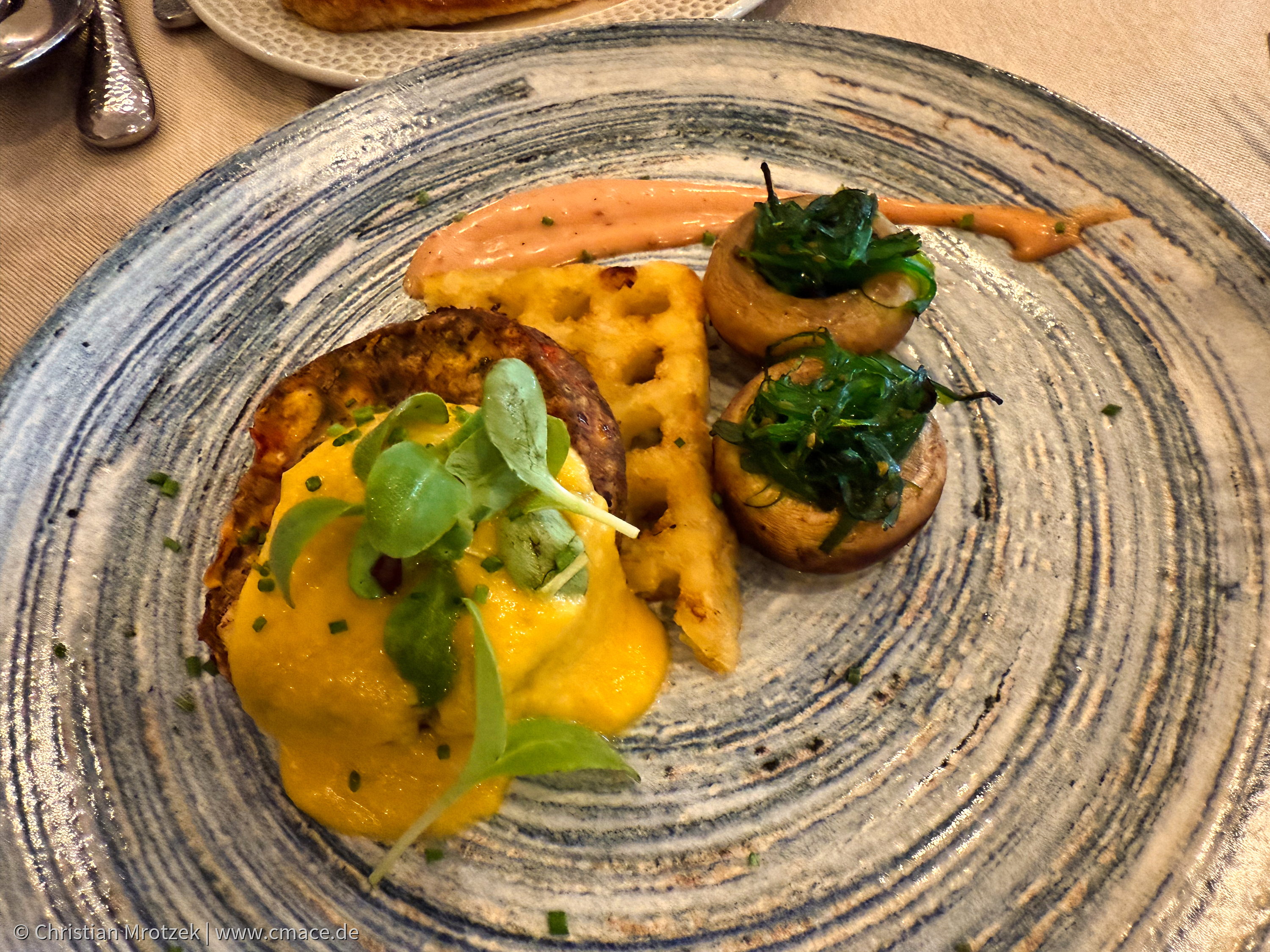 Ein kunstvoll angerichteter Hauptgang vom Buffet des Grupotel Parc Natural & Spa: Eine vegetarische Variation mit gebackener Waffel, gegrilltem Gemüse, cremiger Sauce, frischen Kräutern und gefüllten Champignons mit Algen-Topping. Die moderne Präsentation und die harmonische Kombination aus Farben und Aromen spiegeln die hohe Qualität und Kreativität der Küche wider.