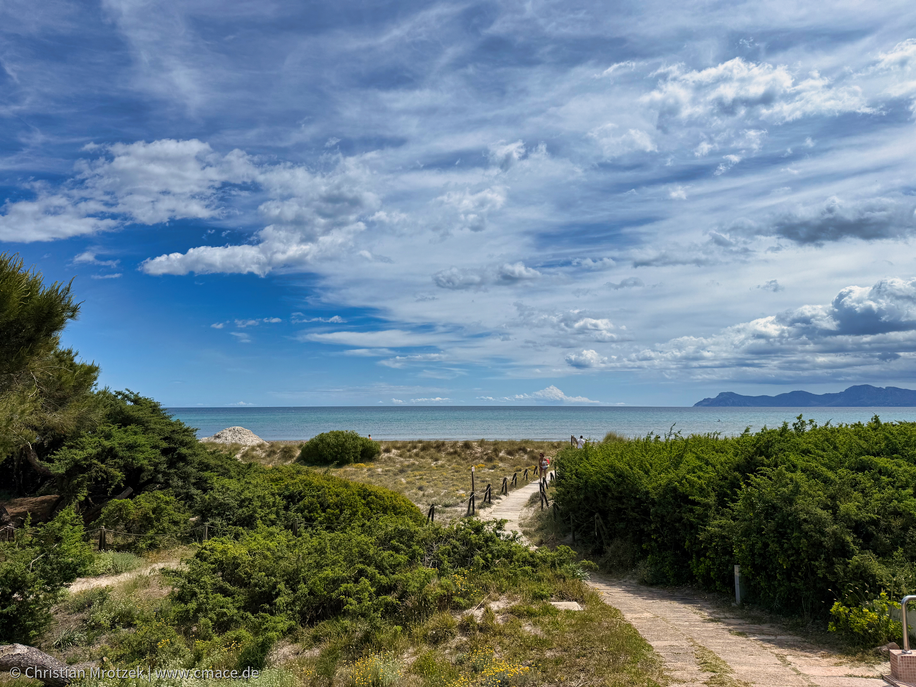 Ein idyllischer Sandweg schlängelt sich durch die grüne Dünenlandschaft direkt zum türkisblauen Meer der Playa de Muro. Umgeben von mediterraner Vegetation und mit weitem Blick auf das Wasser und die Berge im Hintergrund, beginnt hier das perfekte Strandabenteuer. Die natürliche Umgebung und der offene Himmel sorgen für echtes Urlaubsfeeling schon auf dem Weg zum Strand.