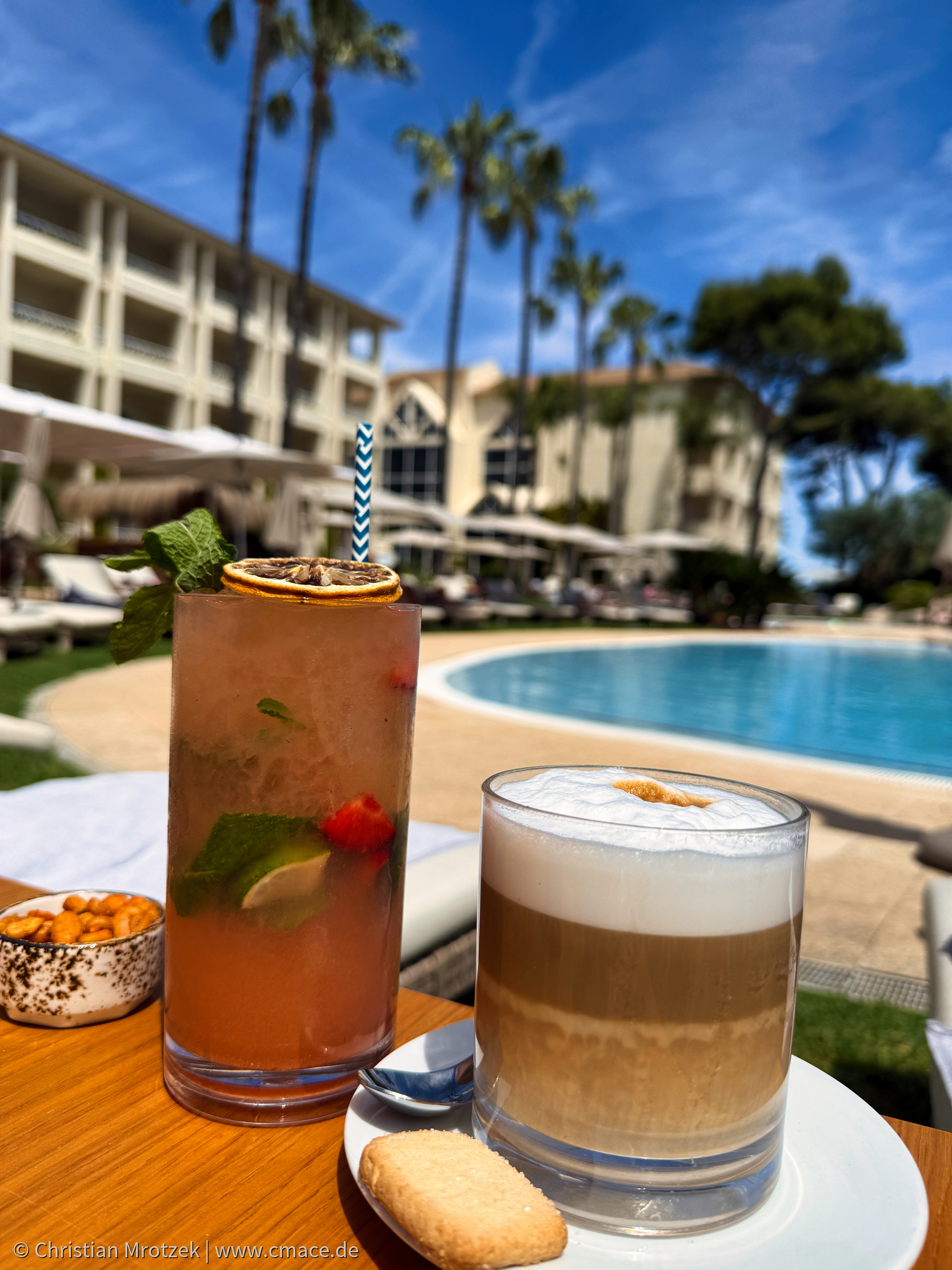 Erfrischender Cocktail mit frischen Früchten, Minze und Limette sowie ein cremiger Cappuccino mit Keks, serviert direkt am Pool des Grupotel Parc Natural & Spa. Im Hintergrund die stilvolle Hotelanlage, Palmen und das strahlend blaue Wasser – perfektes Urlaubsfeeling und entspannte Genussmomente unter der mallorquinischen Sonne.