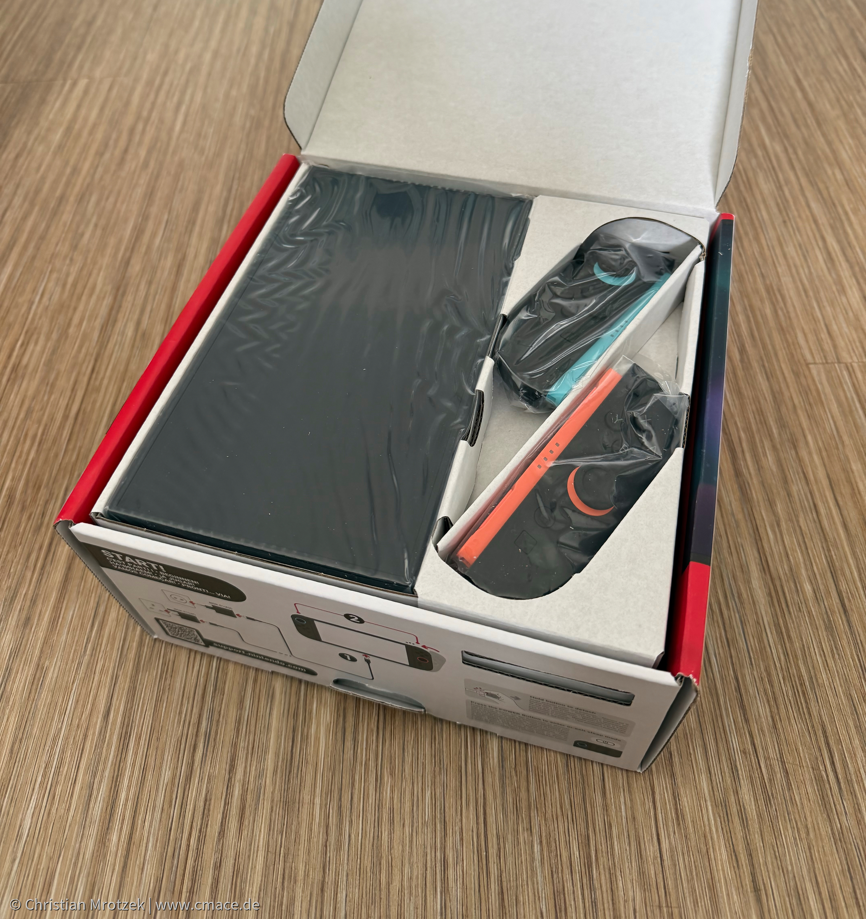 Offener Karton der Nintendo Switch 2, in dem die Konsole und die Joy-Con Controller sicher in ihren Schutzhüllen liegen. Dieses Bild zeigt den ersten Blick auf die neue Hardware und vermittelt das Gefühl, ein neues Nintendo-Gerät auszupacken.Copyright: © Christian Mrotzek 2025